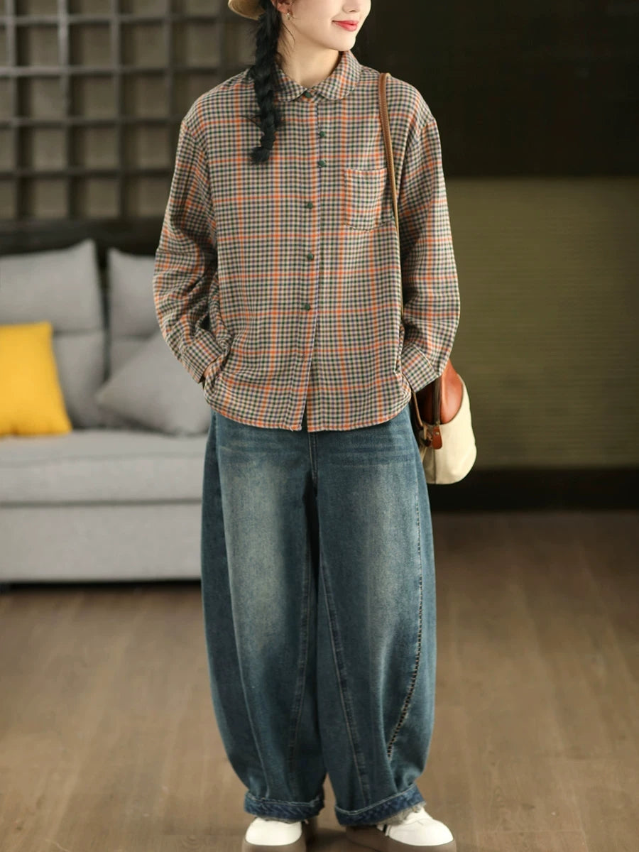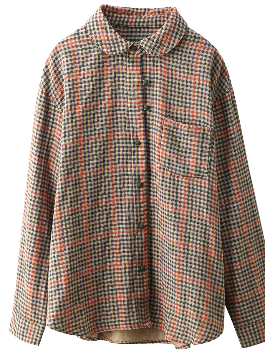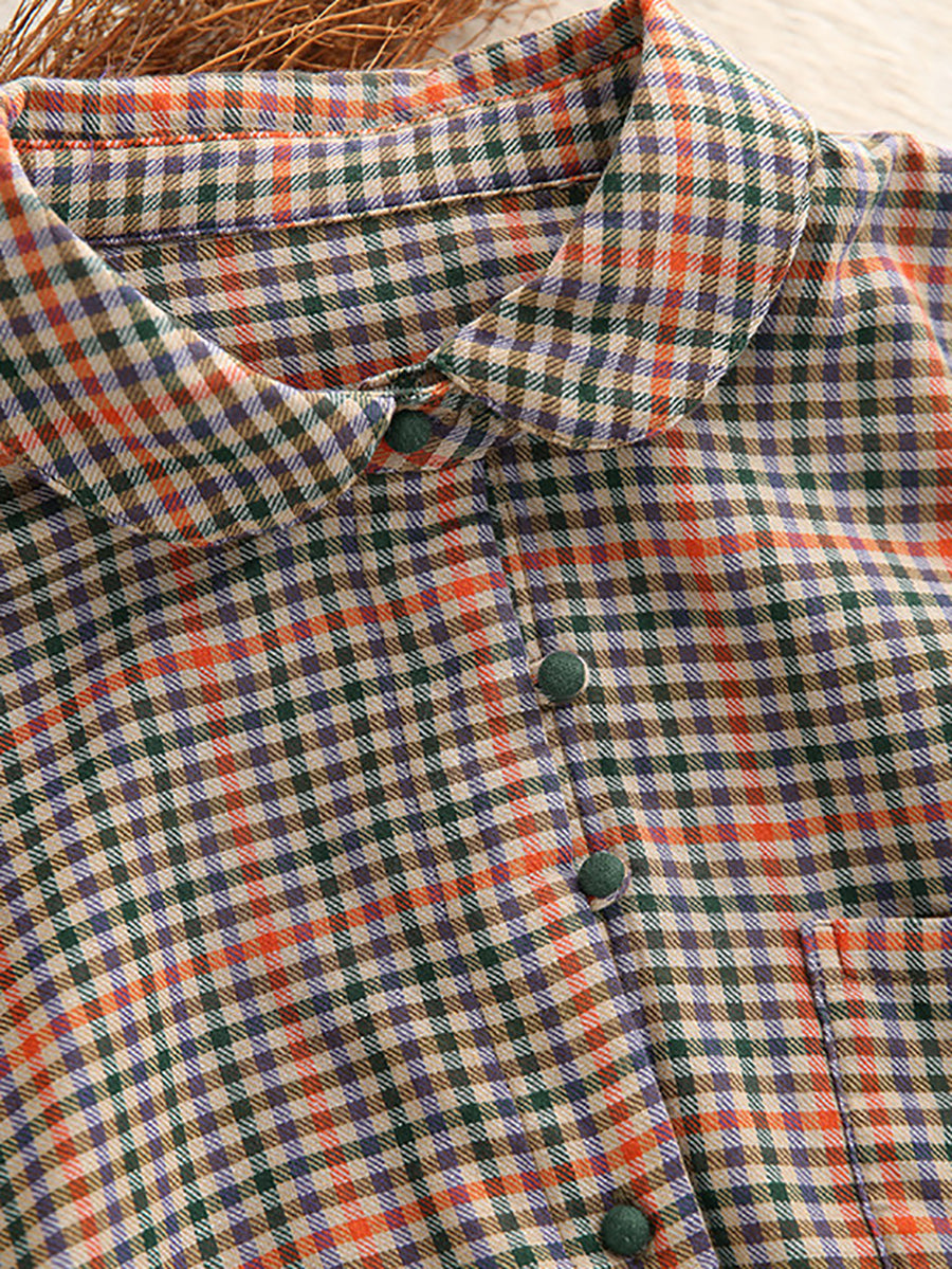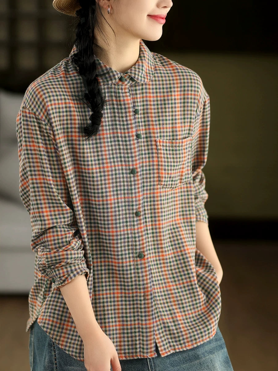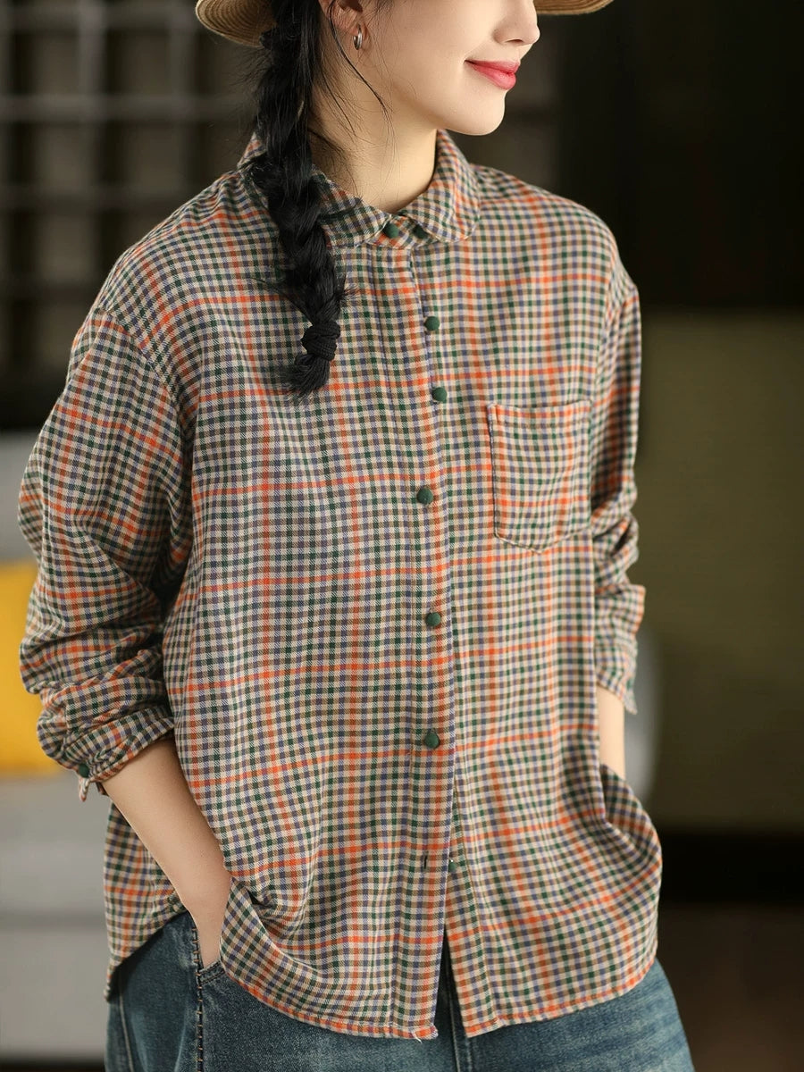 Chemise printanière à carreaux artistiques pour femme, col montant, 100 % coton