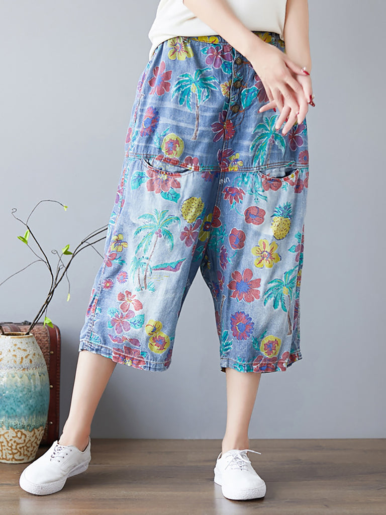 Combinaisons en Denim à jambes droites pour femmes, Vintage, motif Floral, effiloché, poches, jambes droites