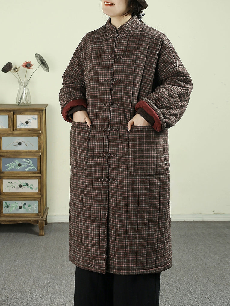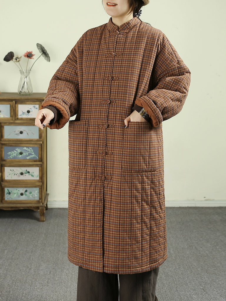Manteau d'hiver rétro à carreaux pour femme, col montant et matelassé