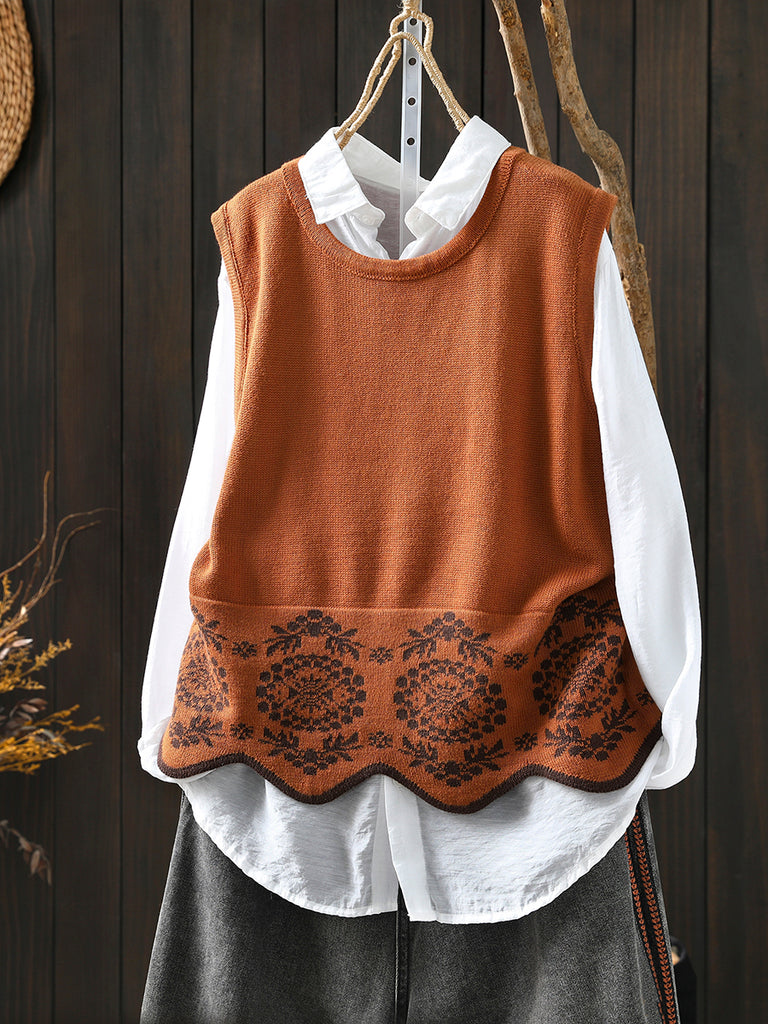 Gilet tricoté à col rond et ourlet ondulé à fleurs artistiques pour femme