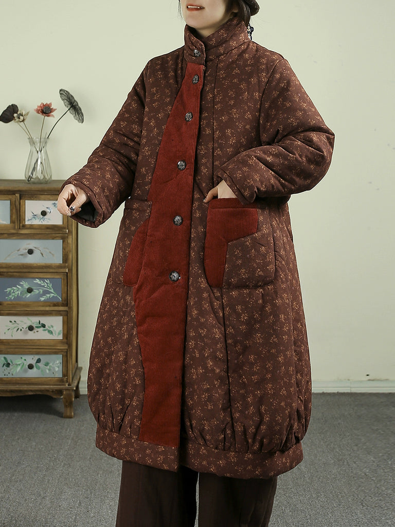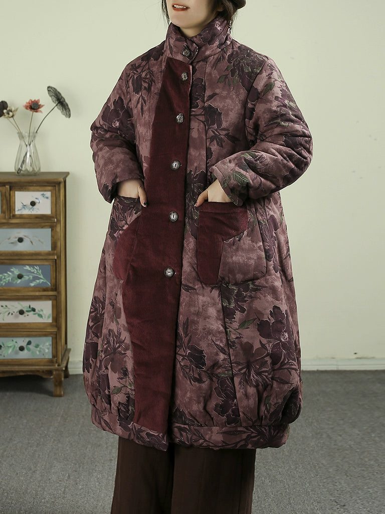Manteau d'hiver pour femme en velours côtelé à fleurs, col montant et matelassé