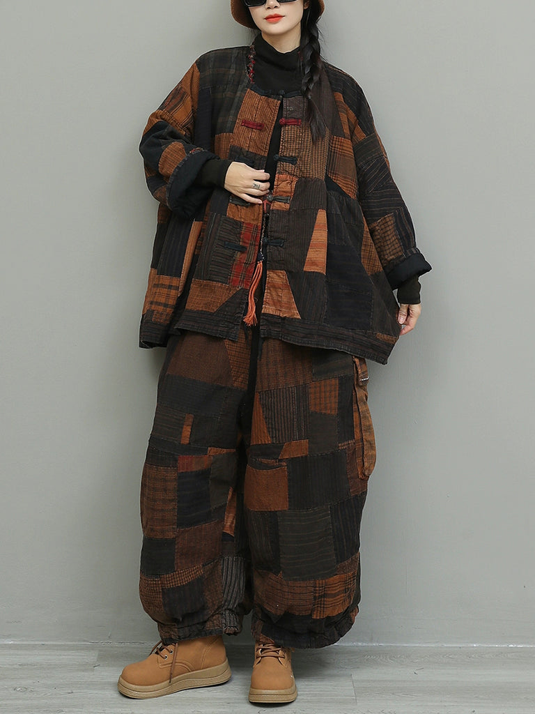Combinaisons d'hiver rétro patchwork à col rond rembourrées pour femmes