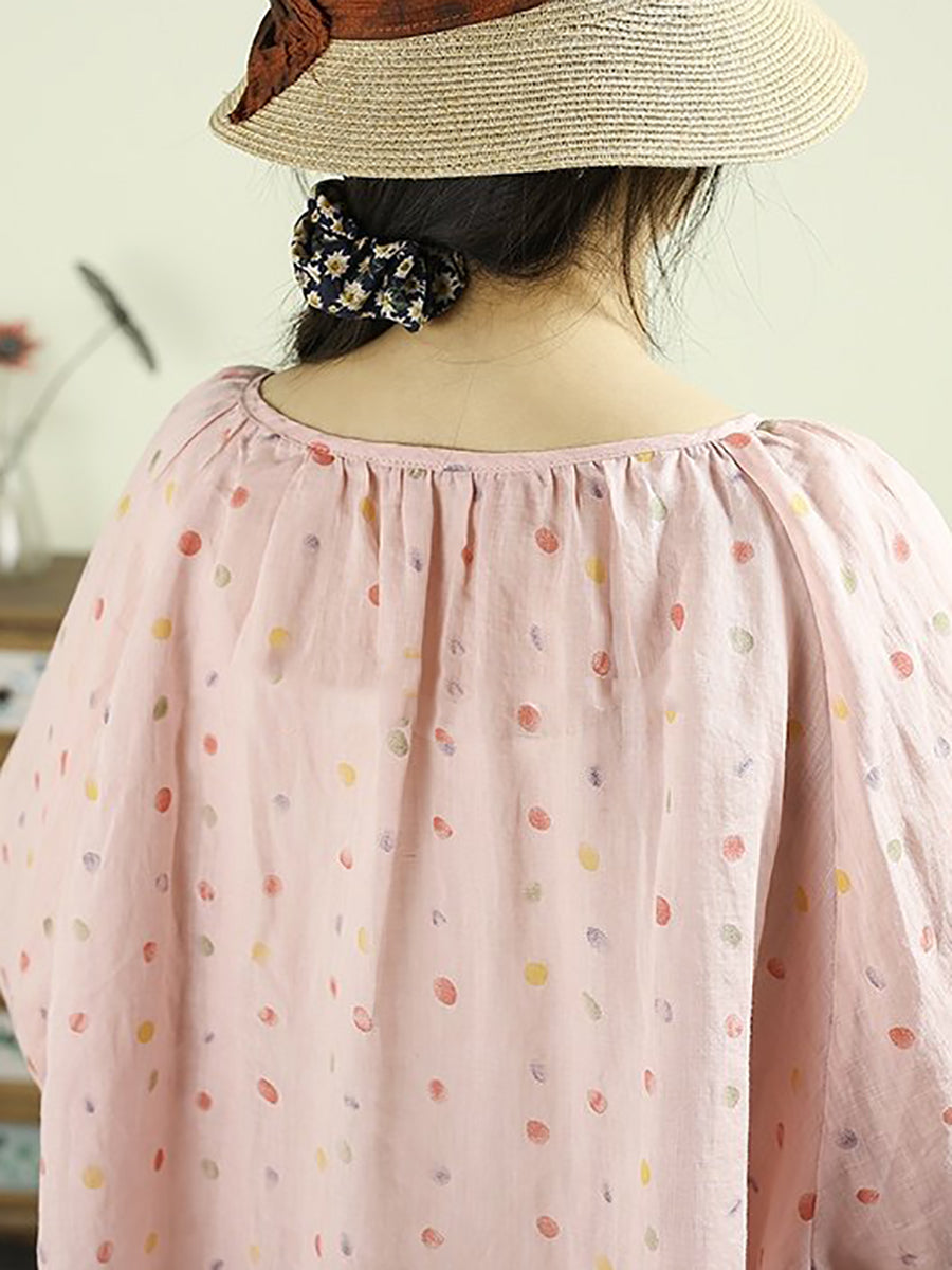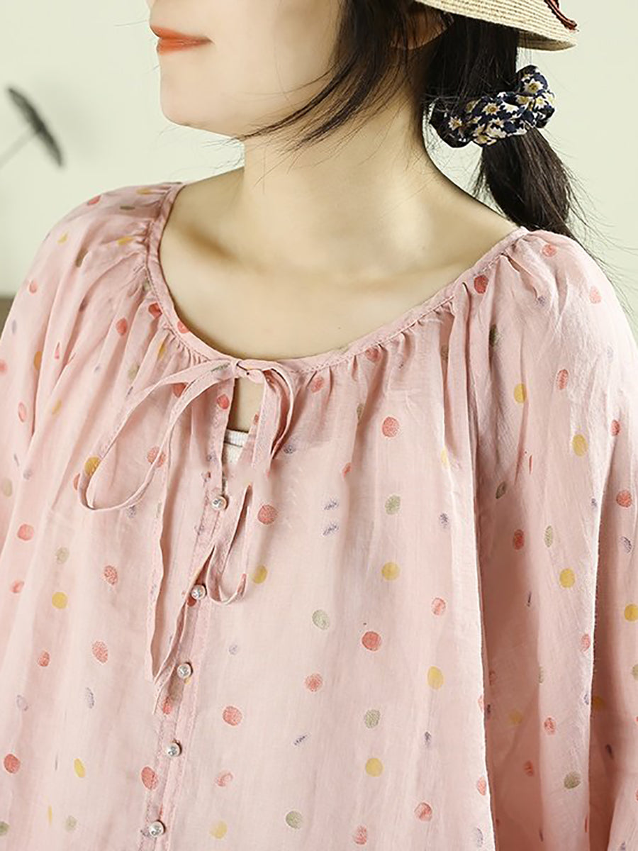 Chemise à pois printanière pour femme, col rond, 100 % ramie