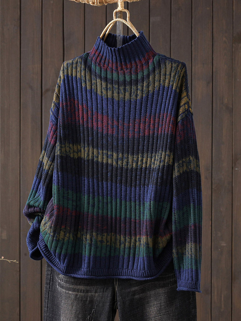 Orné d'un motif rayé, ce pull possède un col roulé mi-long et des manches raglan au design vintage. Idéal pour le printemps et l'automne, il allie style classique et confort saisonnier.