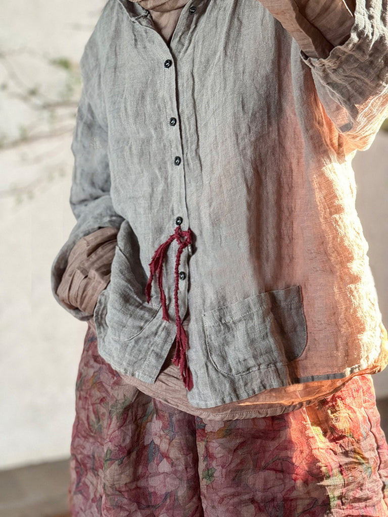 Chemise à capuche boutonnée en lin uni vintage grande taille pour femme
