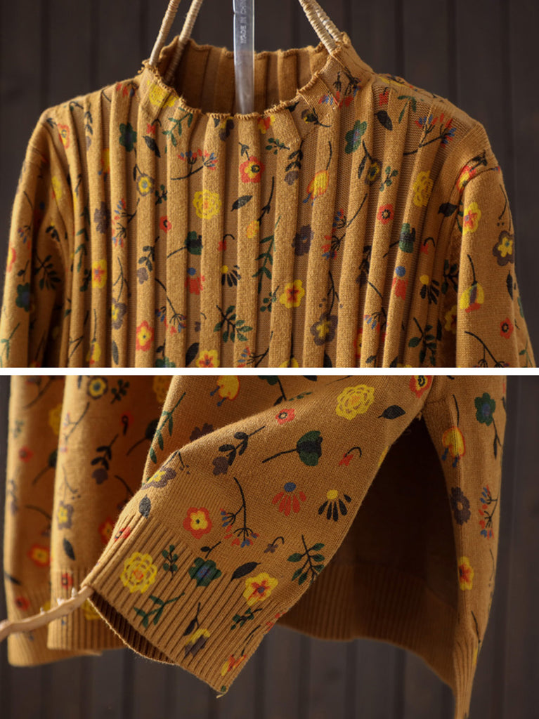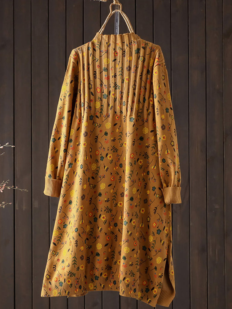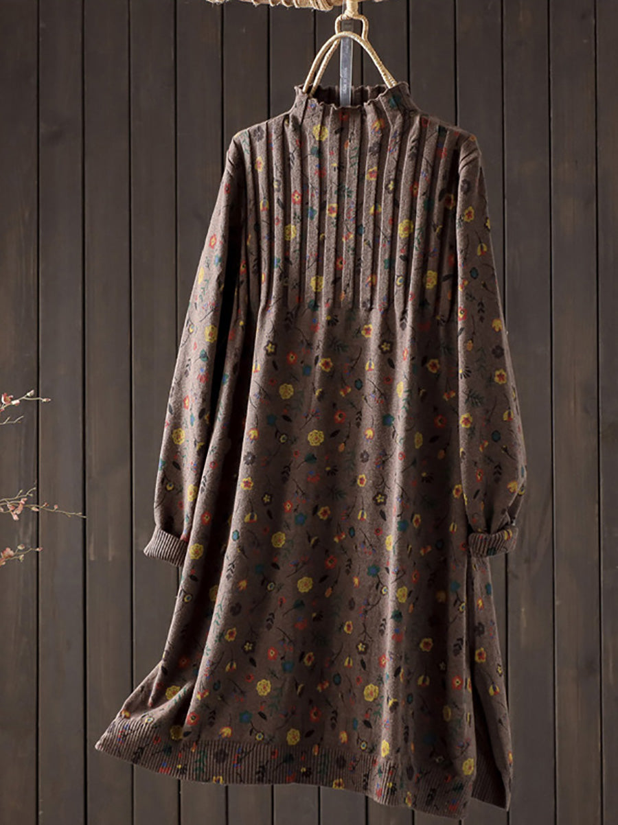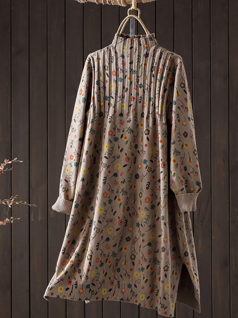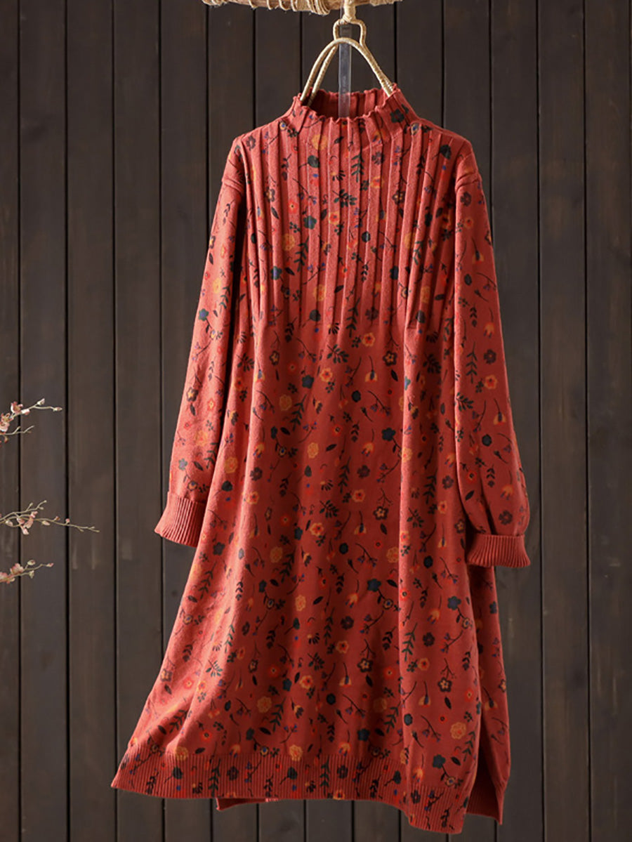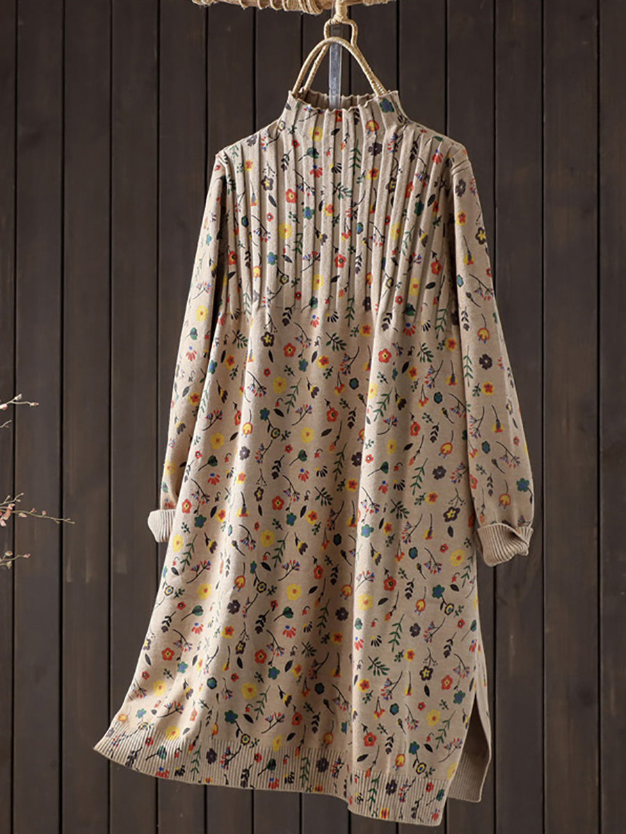 Robe en maille à col roulé mi-long à fleurs style vintage automne pour femme