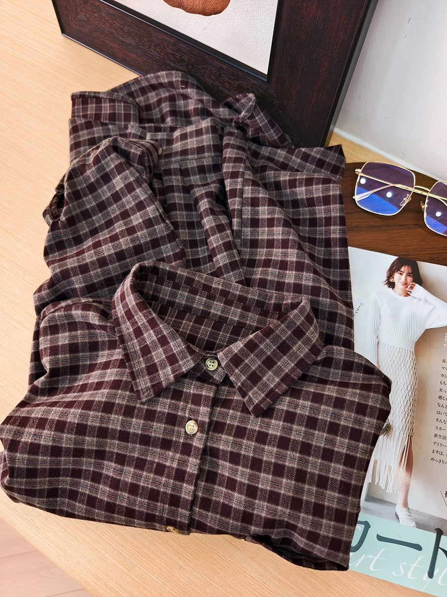 Chemise à col rabattu à carreaux vintage pour femme, automne