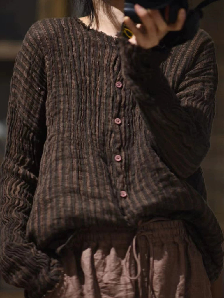 Chemise d'été en lin à col rond et rayures rétro pour femme