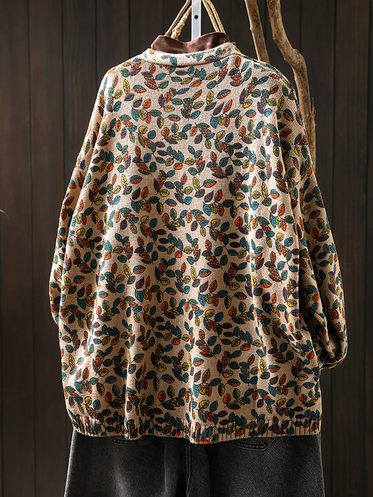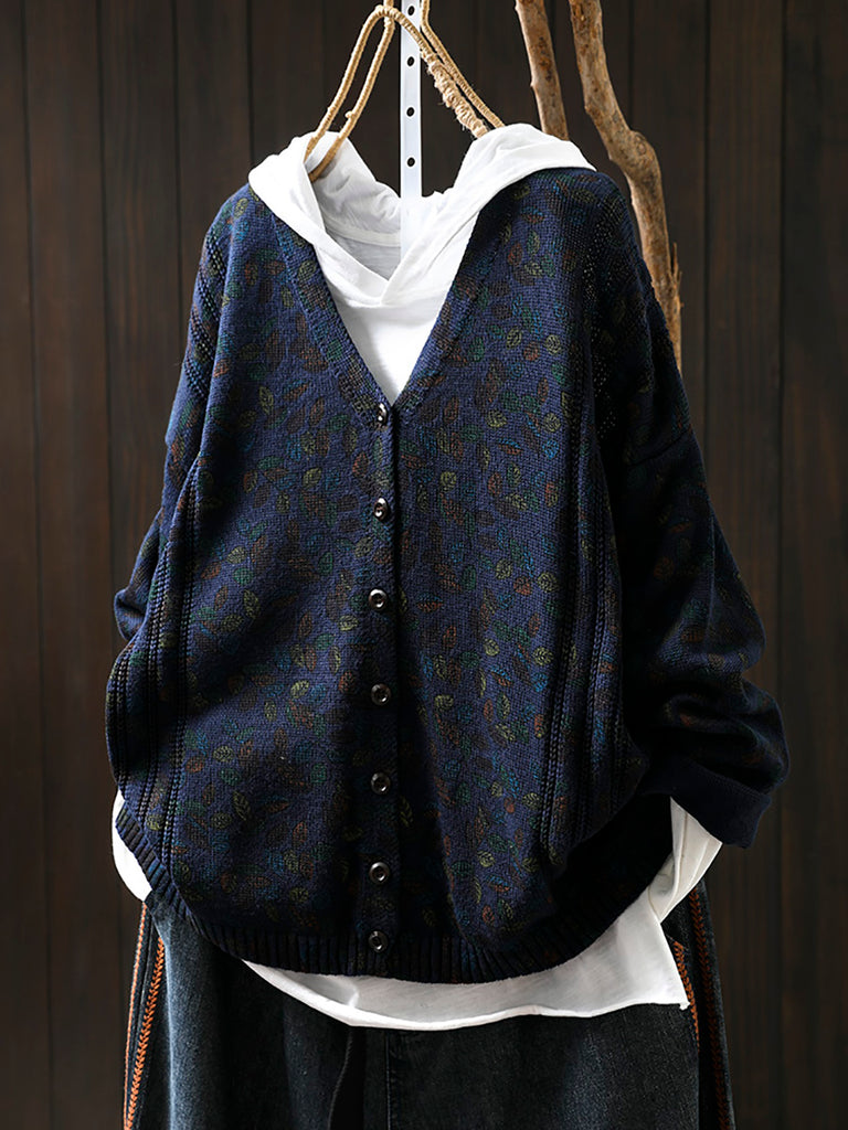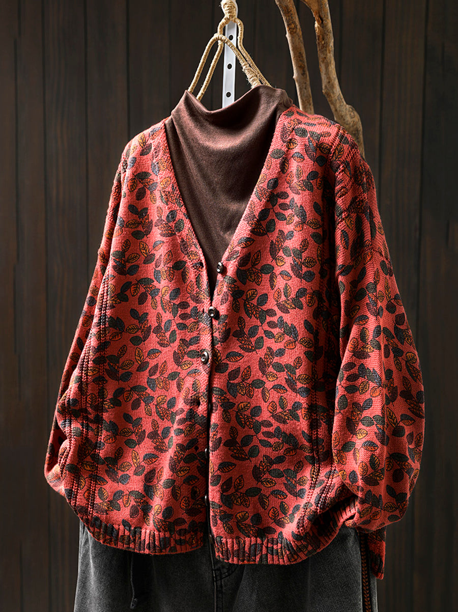 Cardigan tricoté à col en V pour femme, motif feuilles d'automne