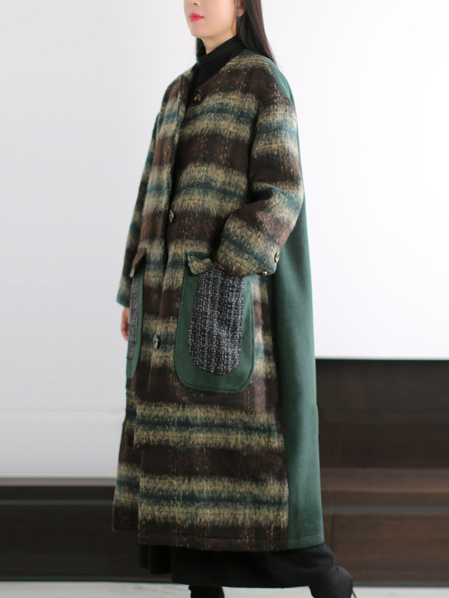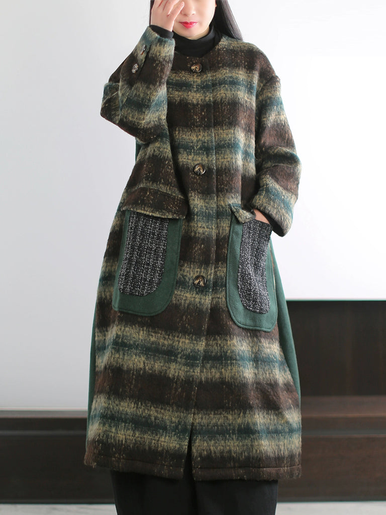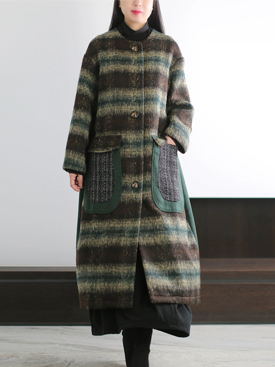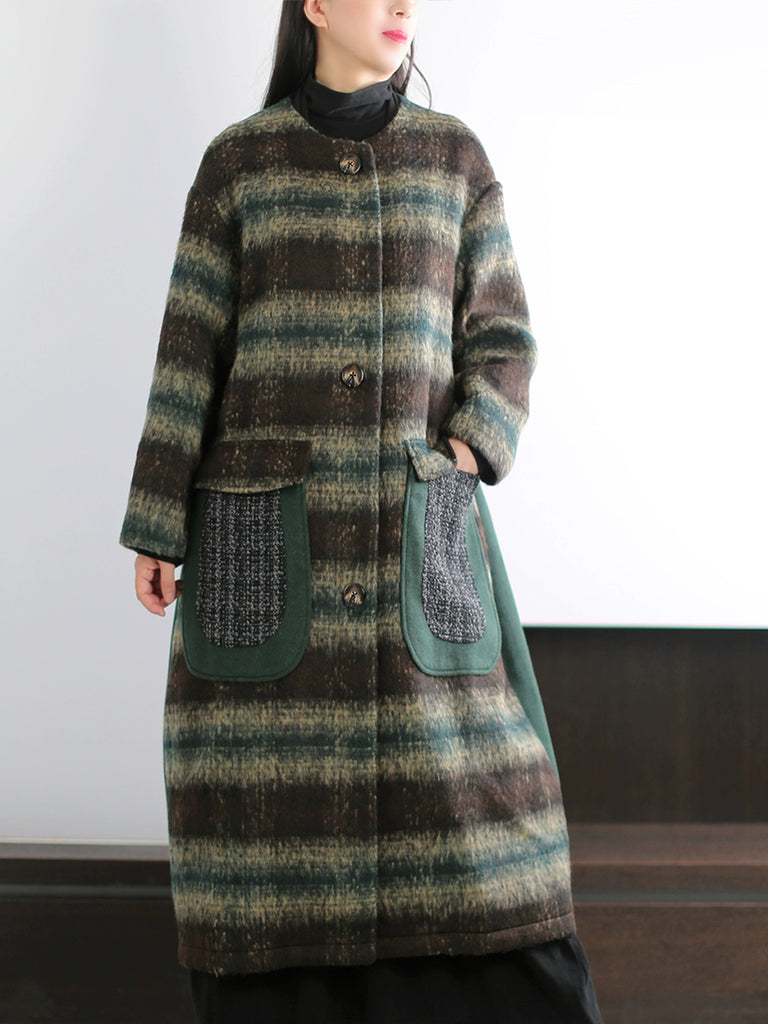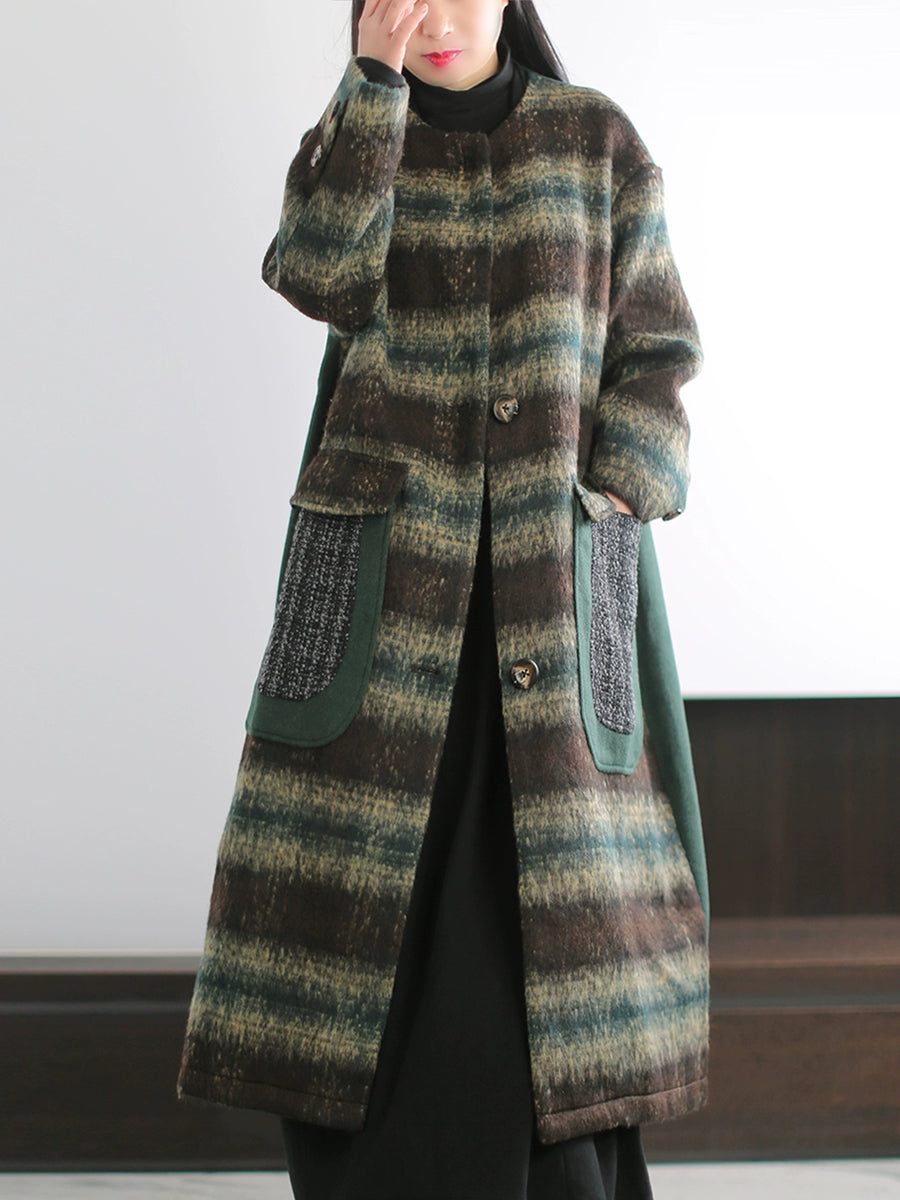 Confectionné dans un mélange de laine de qualité supérieure (85 % laine, 15 % polyester), ce pardessus d'inspiration vintage arbore un motif rayé distinctif et un col montant structuré. Ses manches raglan lui confèrent des proportions élégantes, tandis que sa silhouette cocon offre une coupe flatteuse et décontractée. Conçu pour l'automne et l'hiver, ce modèle rétro allie style intemporel, chaleur et confort.