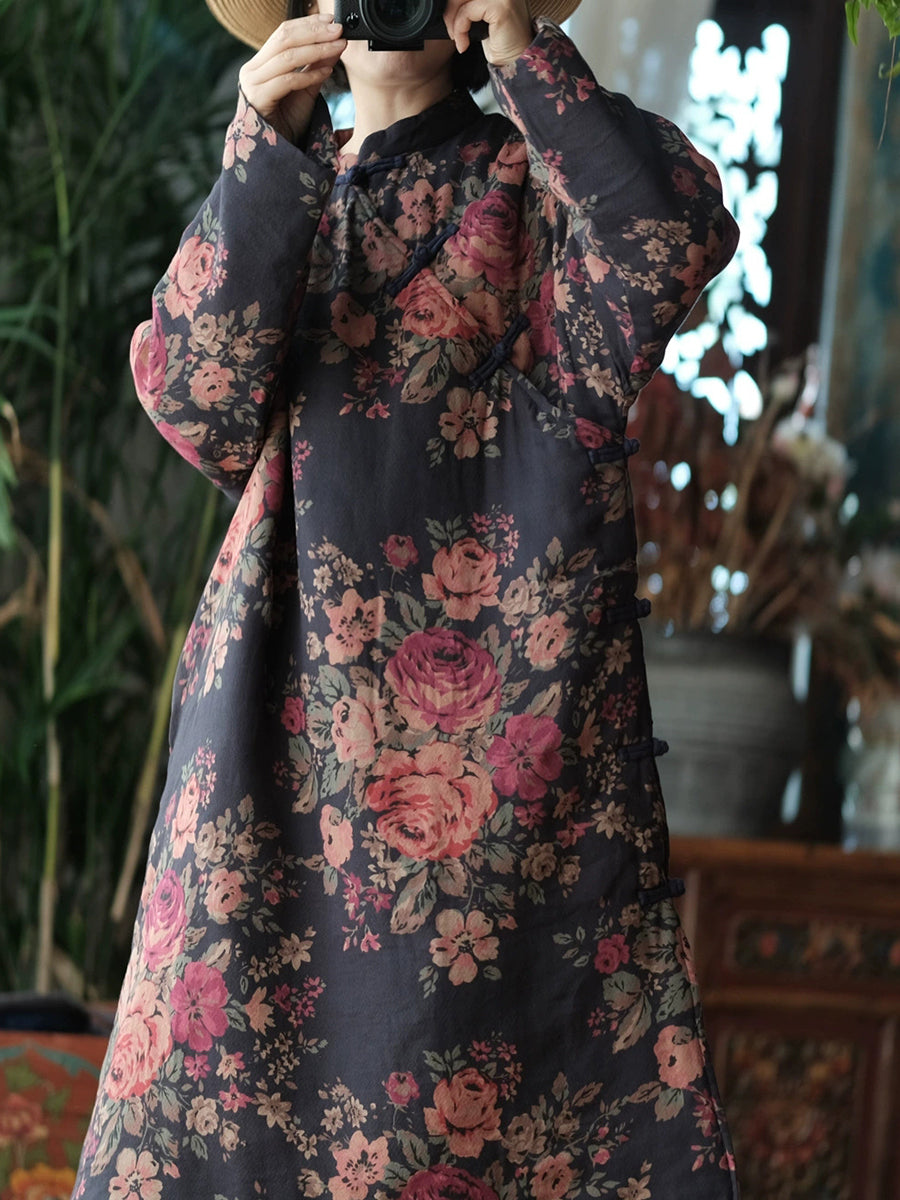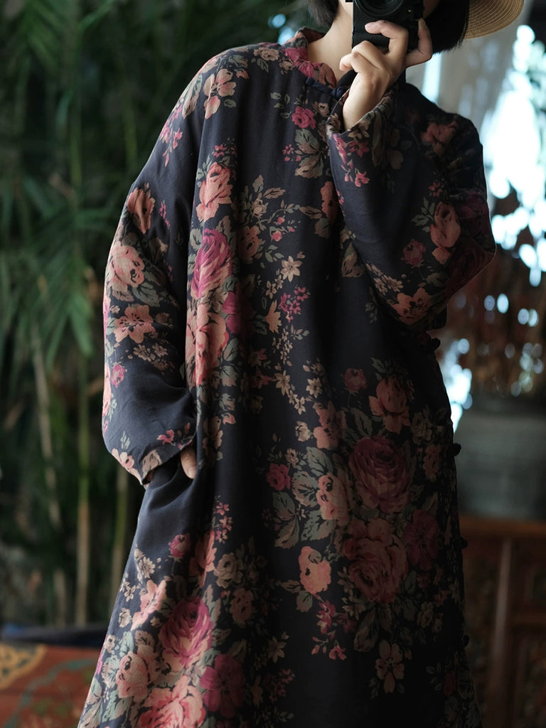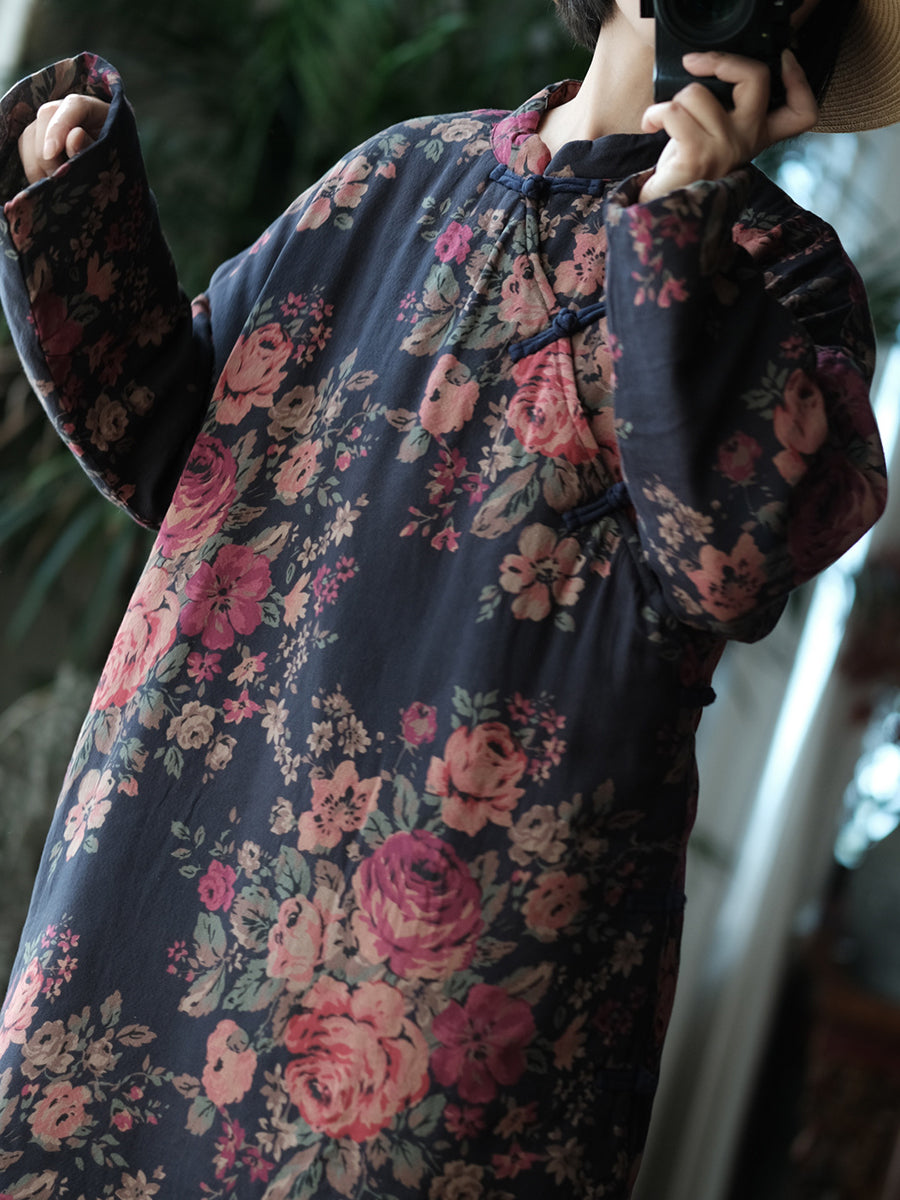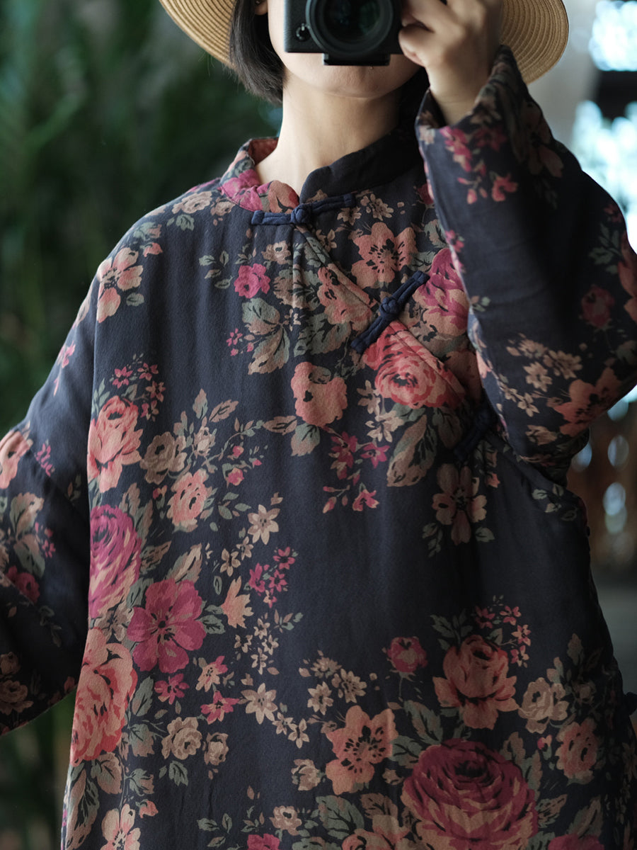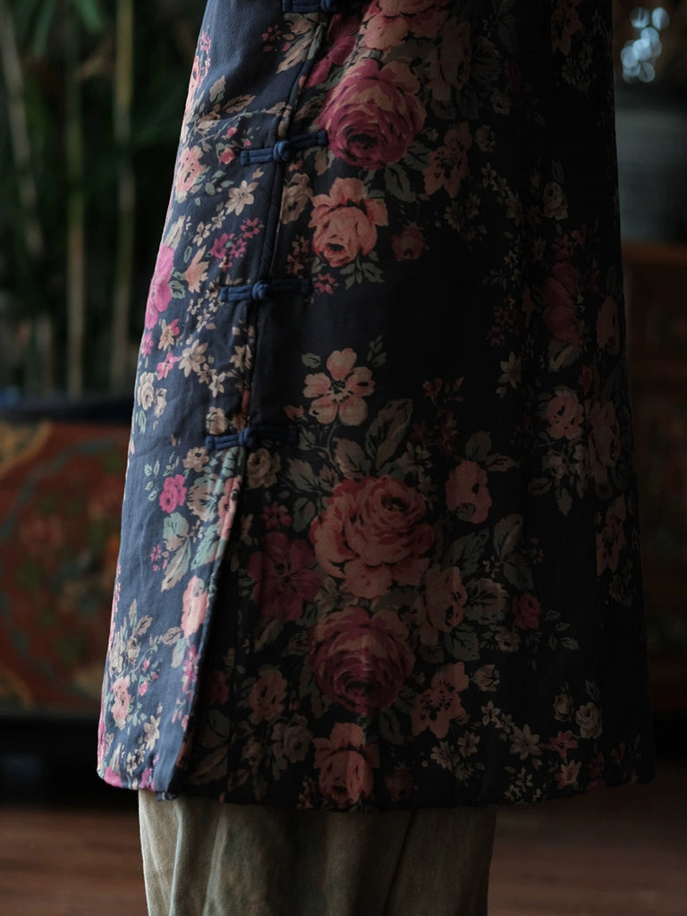 Manteau d'hiver rétro à fleurs pour femme, col montant et matelassé