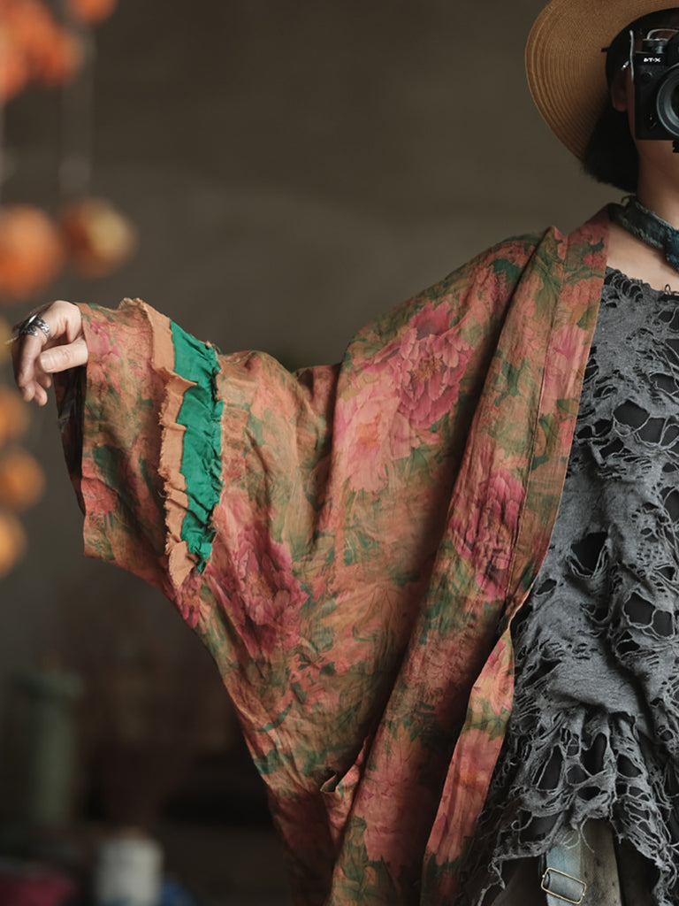 Manteau chemise en ramie à col en V et fleurs artistiques pour femme