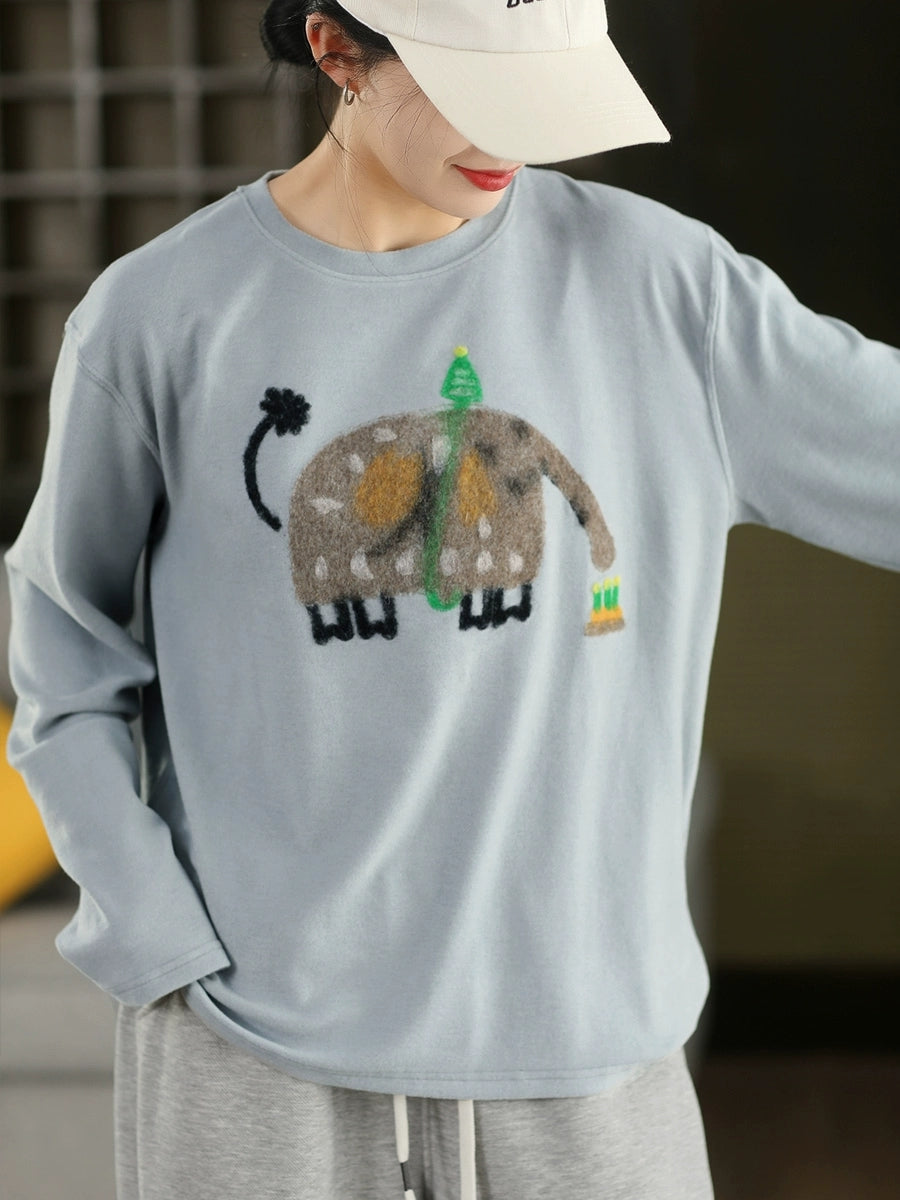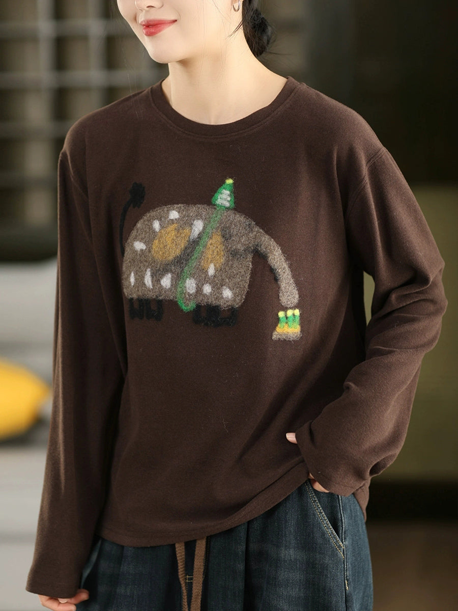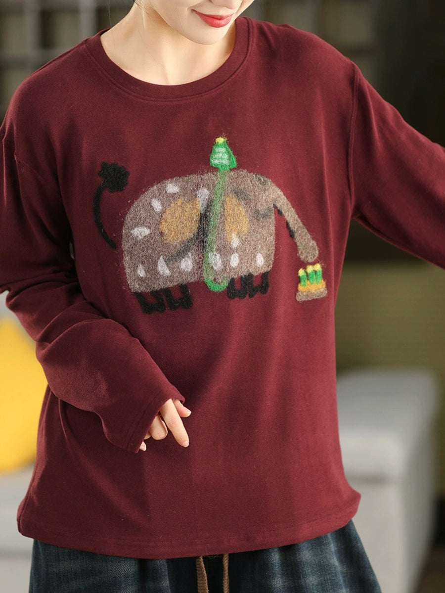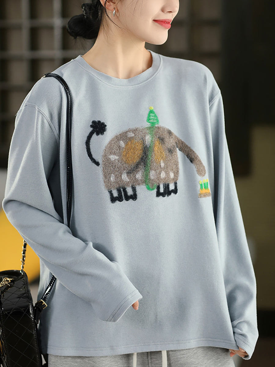 Blouse d'hiver pour femme, style artistique, à col rond et imprimé éléphant floqué.