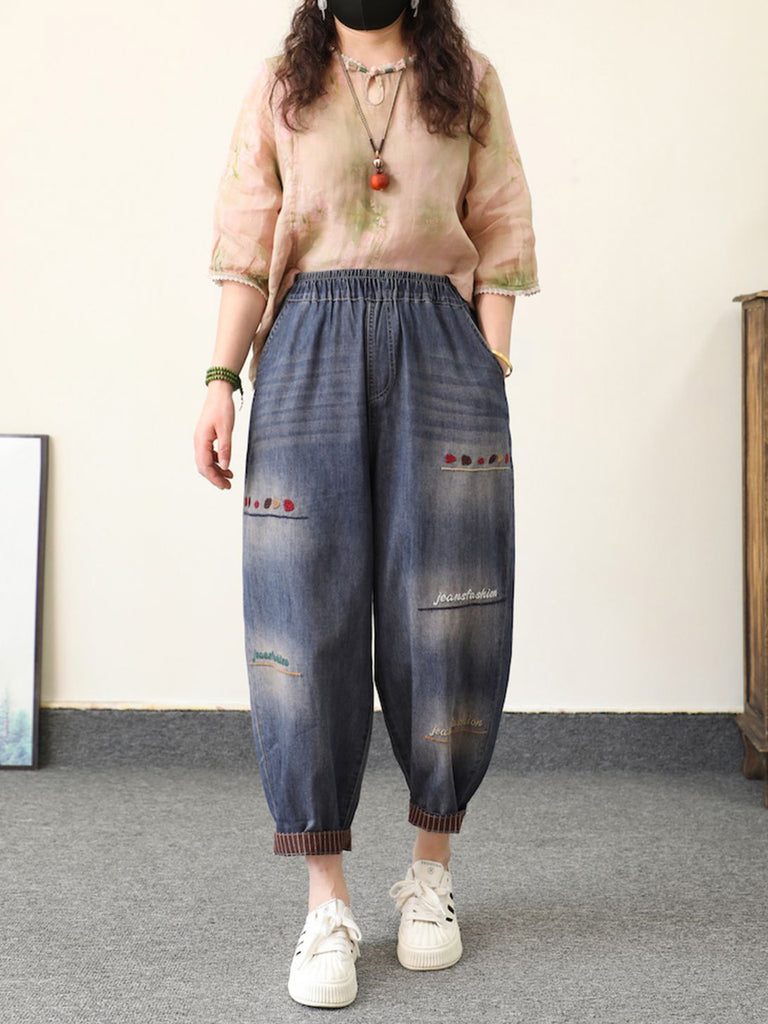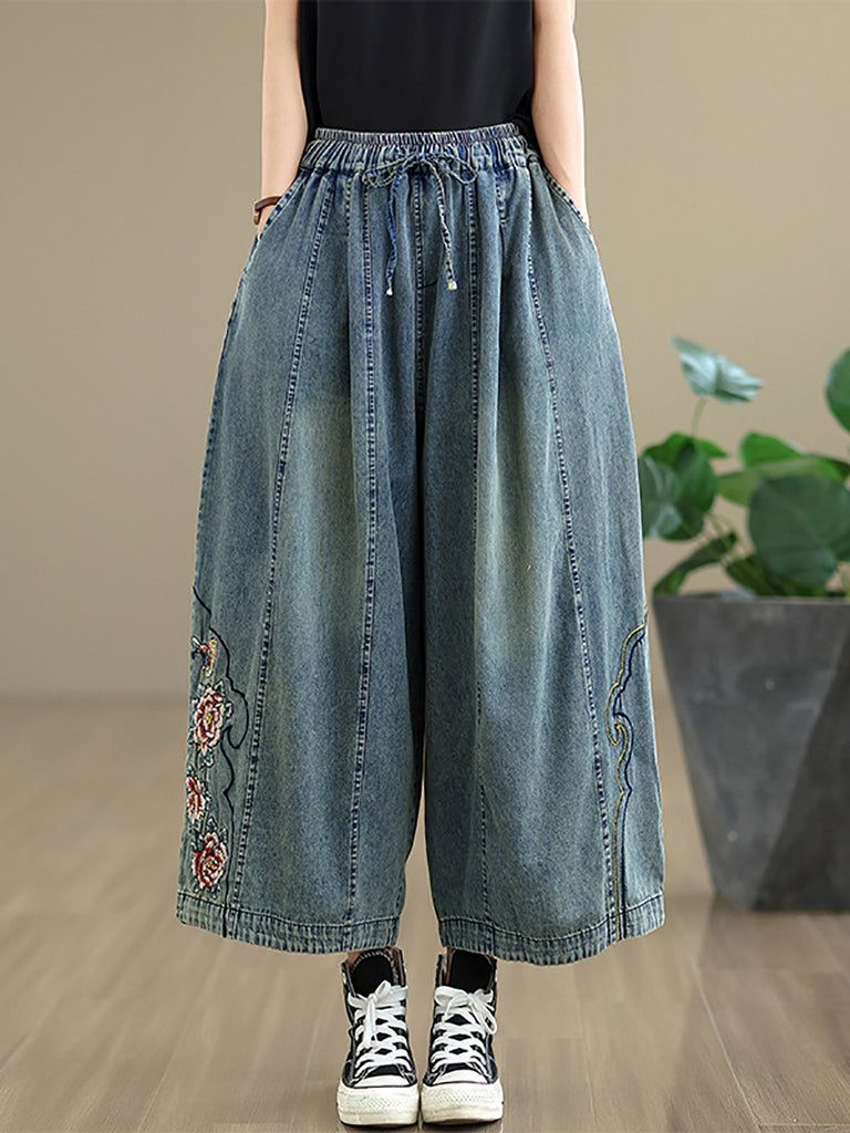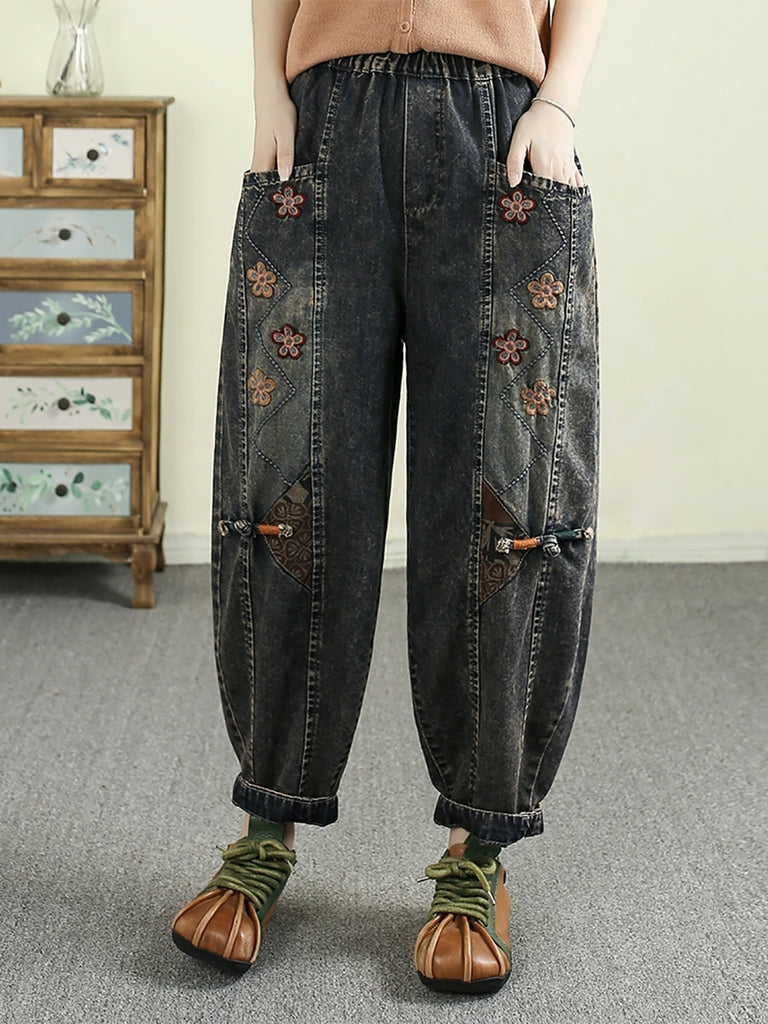 Pantalon sarouel en denim brodé de fleurs de printemps rétro pour femme