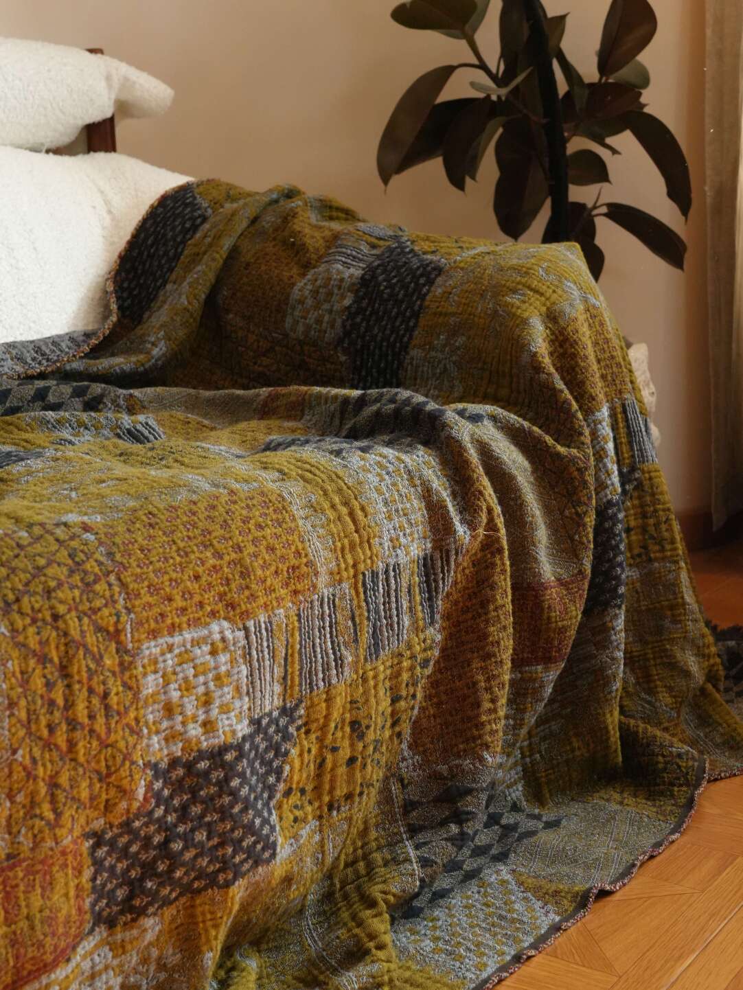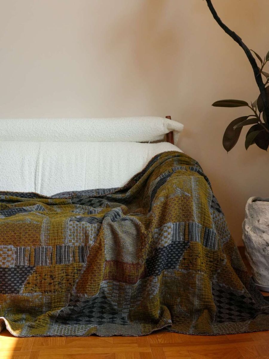 Couverture de canapé rétro en coton et lin patchwork moutarde foncé