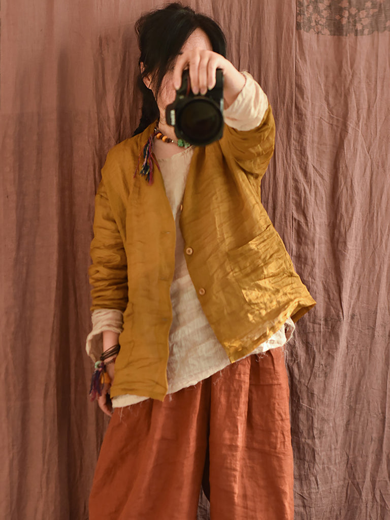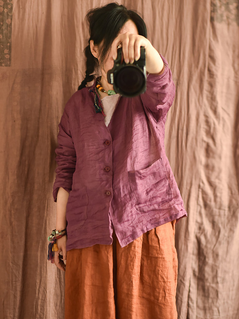 Chemise boutonnée en lin à bords bruts et à fleurs vintage pour femme