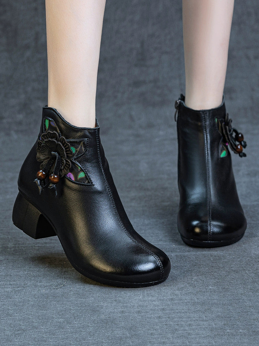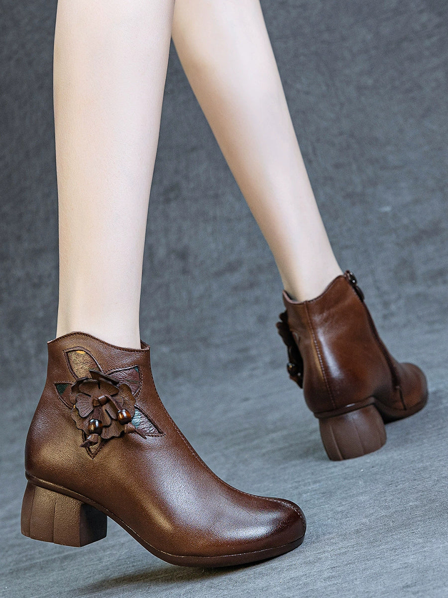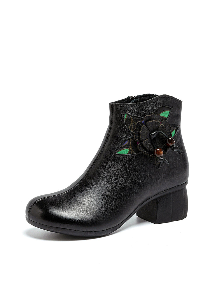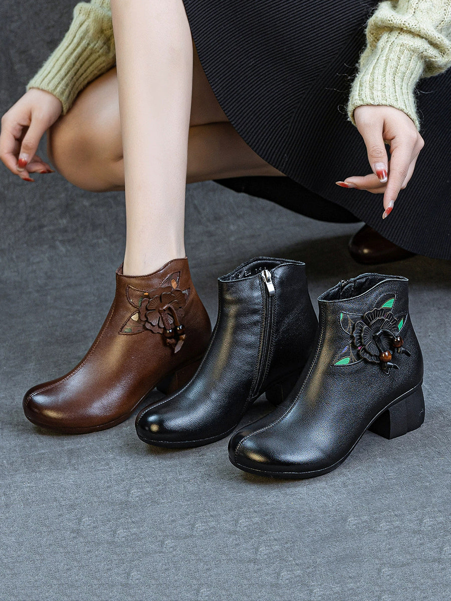 Bottines d'hiver pour femmes en cuir fendu à talons moyens et à fleurs