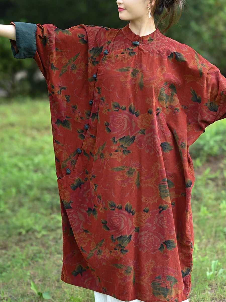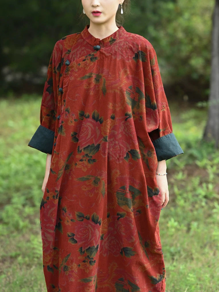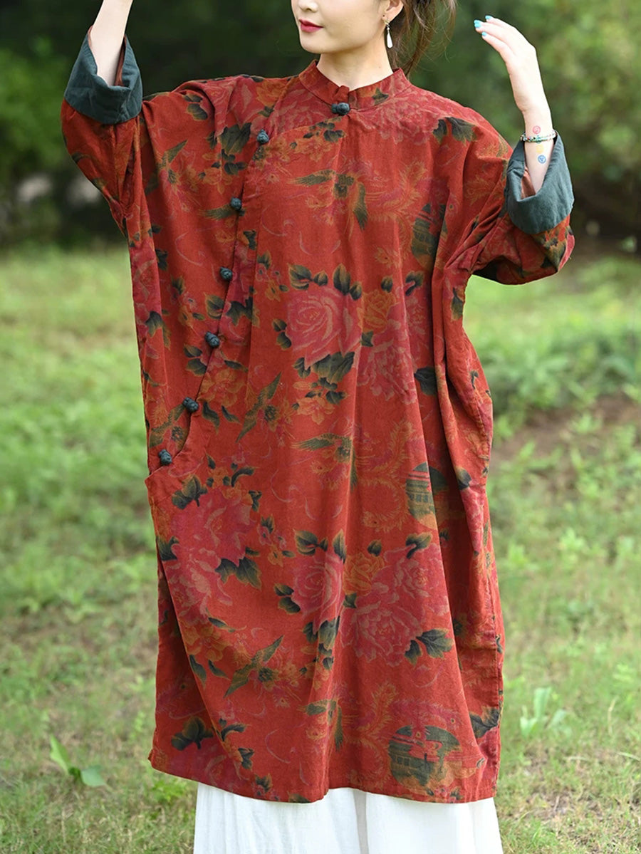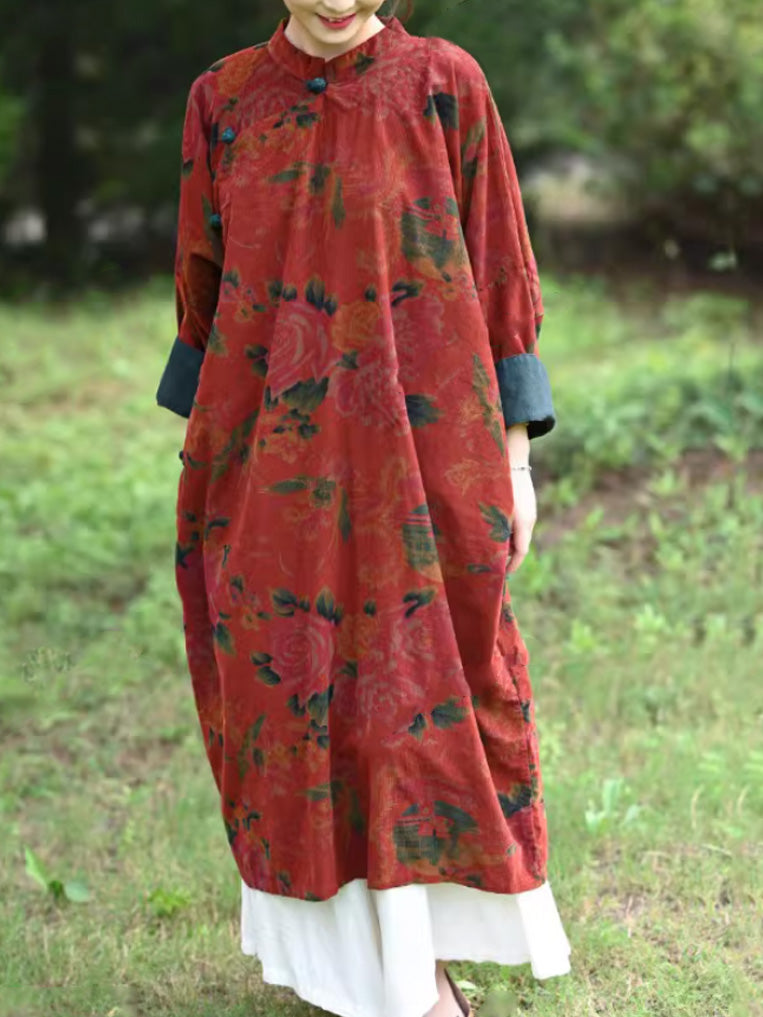 Robe d'automne vintage à fleurs pour femme, col montant, 100 % coton