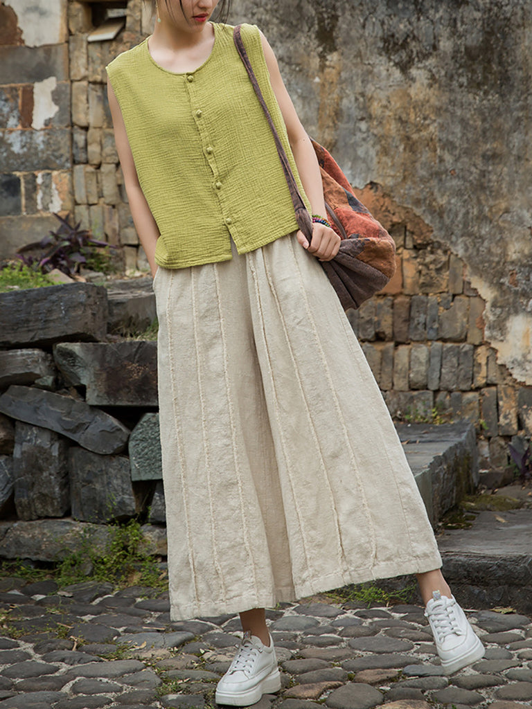 Pantalon large en ramie à bords bruts pour femme, porté l'été