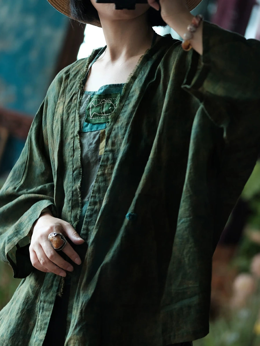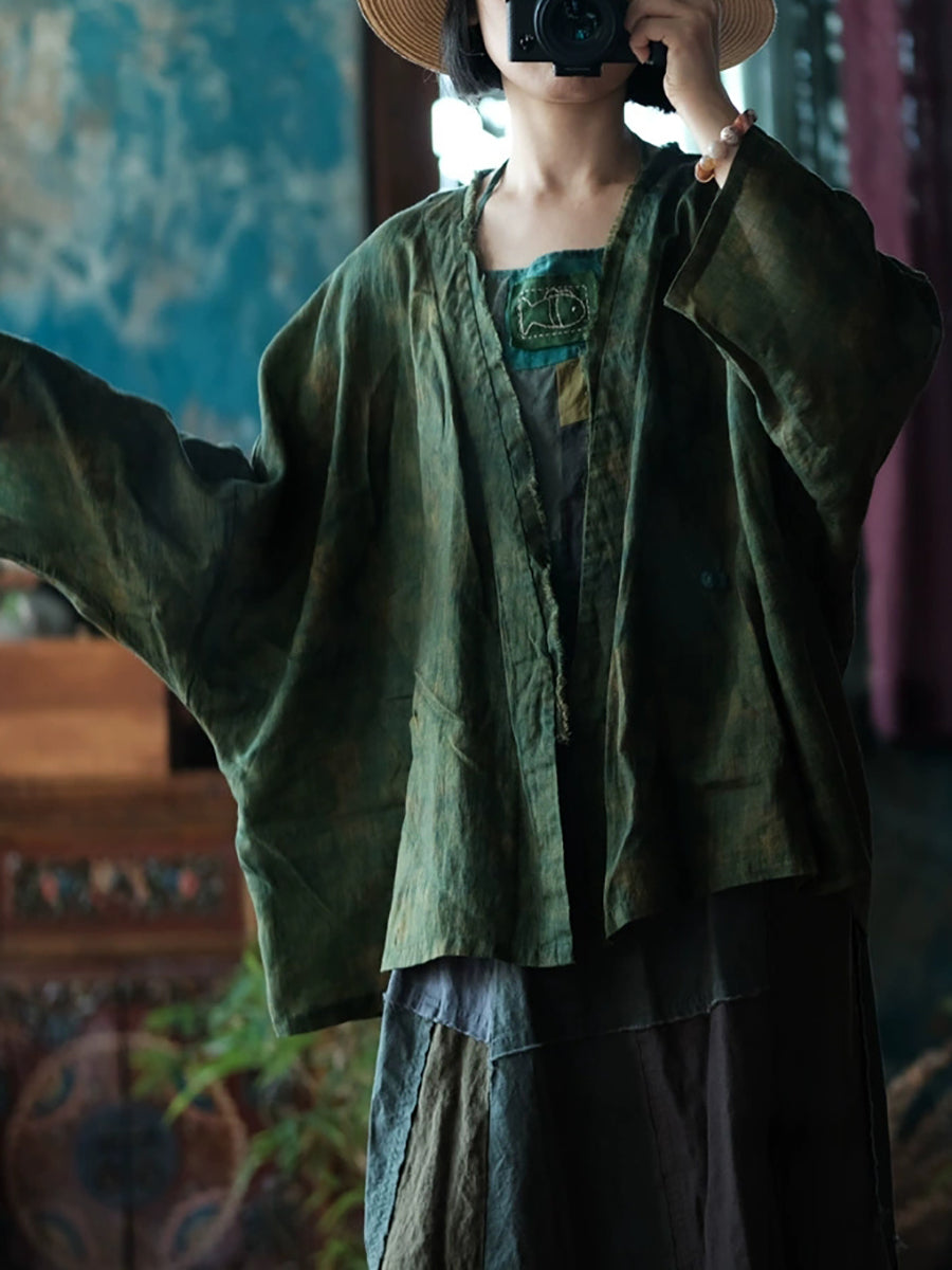 Manteau chemise col V en lin tie-dye rétro d'été pour femme