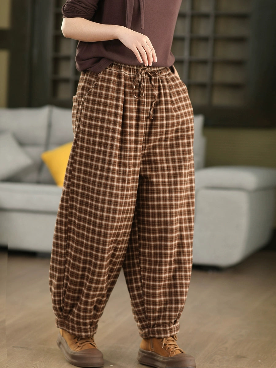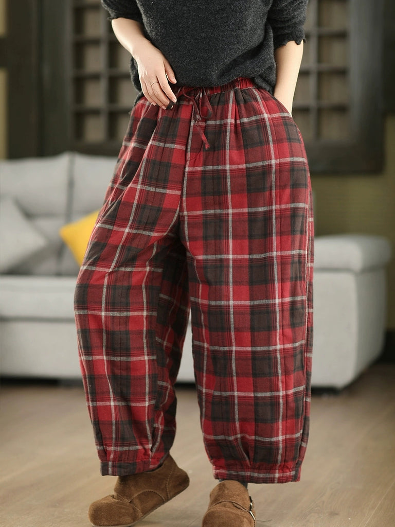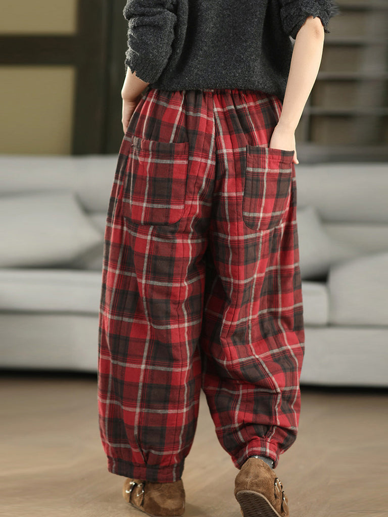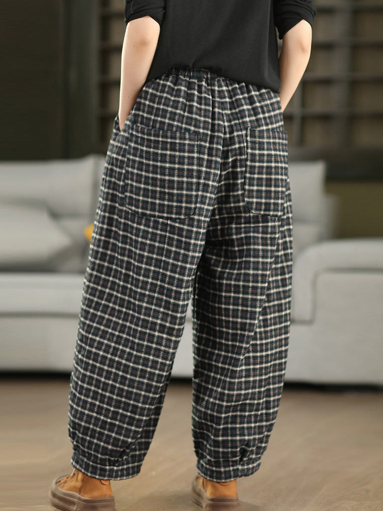 Pantalon harem rembourré à carreaux rétro hiver pour femme, 100 % coton