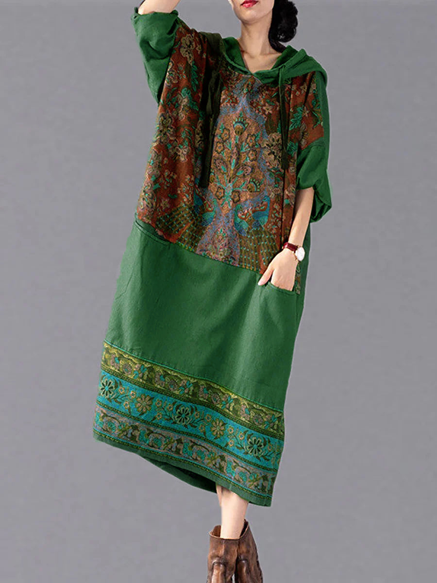Robe à capuche longue avec poches et fleurs ethniques pour femmes