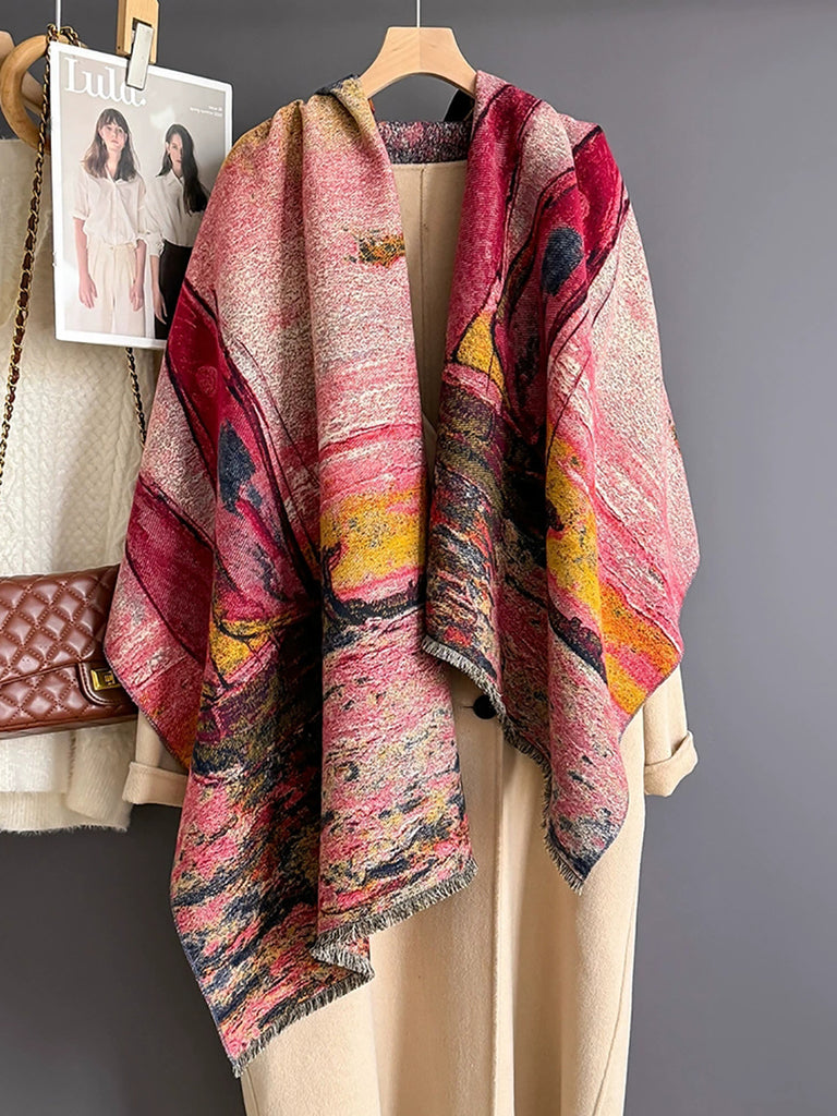 Châle écharpe à pompon imprimé en coton artistique vintage