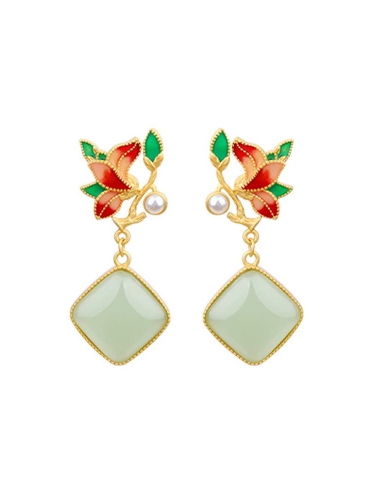 Boucles d'oreilles vintage en argent S925 et jade pour femme, motif fleur émaillé