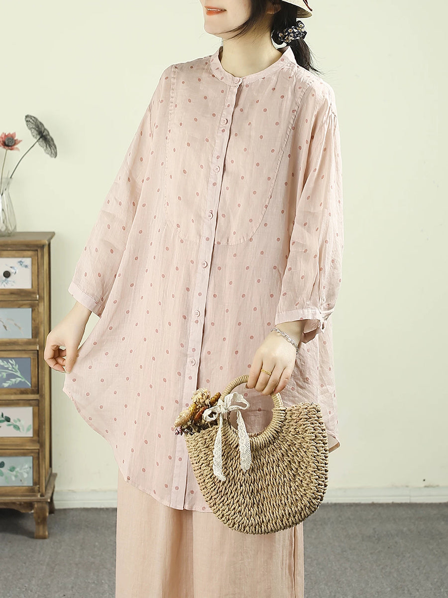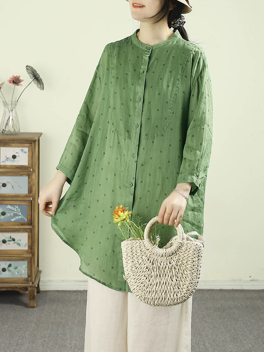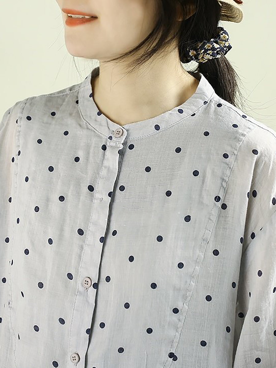 Chemisier à pois printanier pour femme, col montant, 100 % ramie