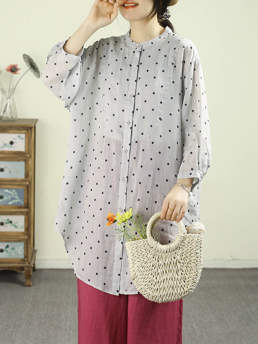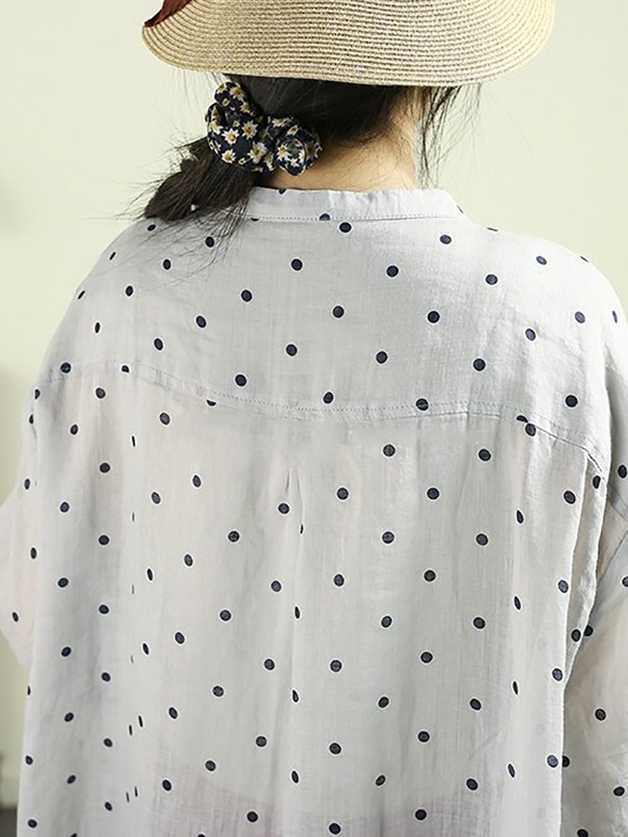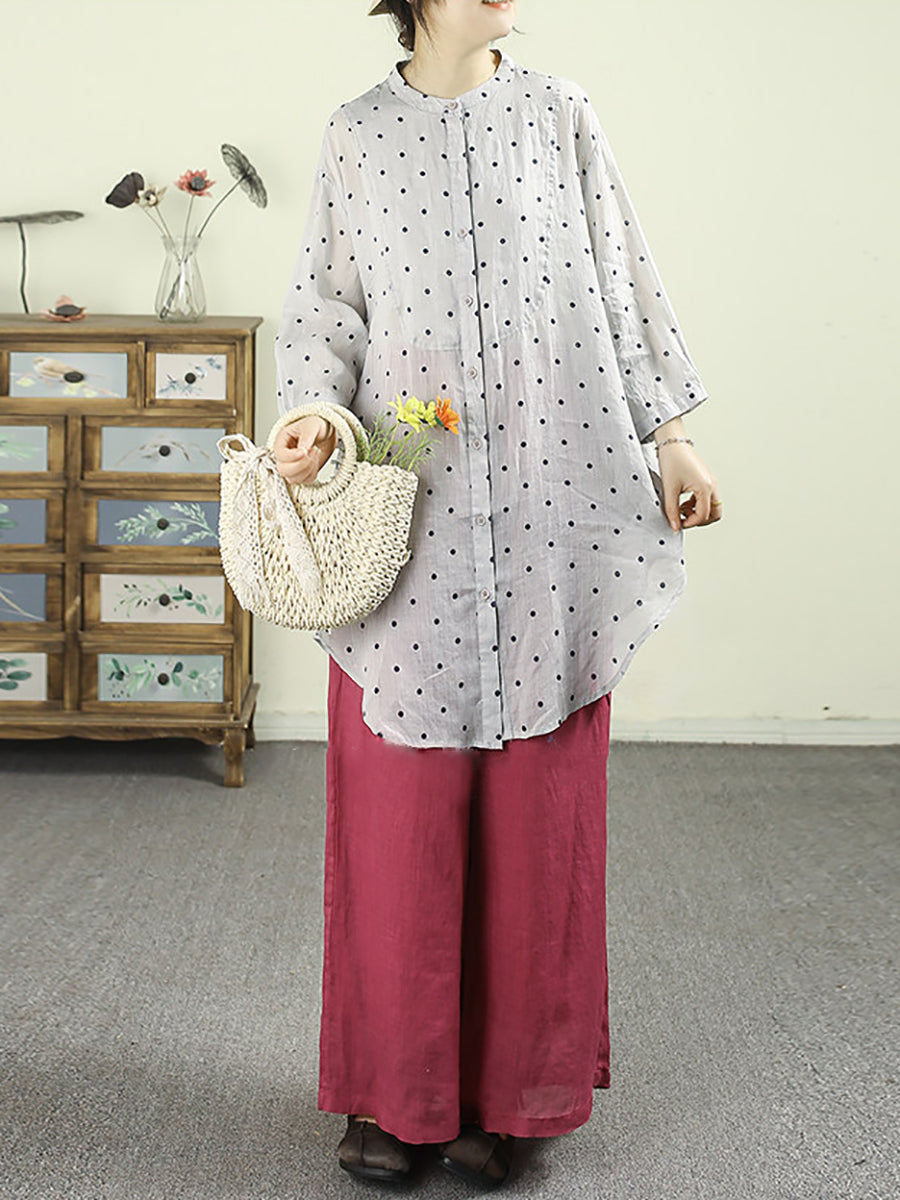 Chemisier à pois printanier pour femme, col montant, 100 % ramie