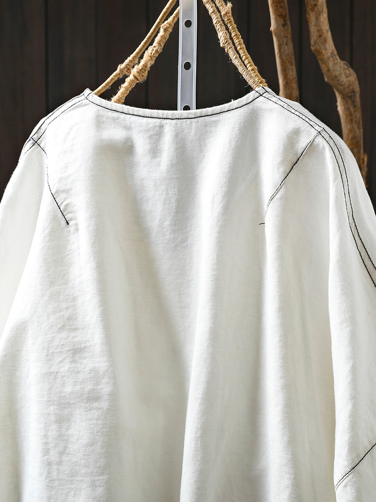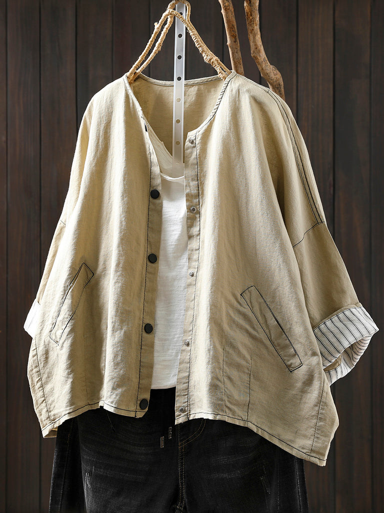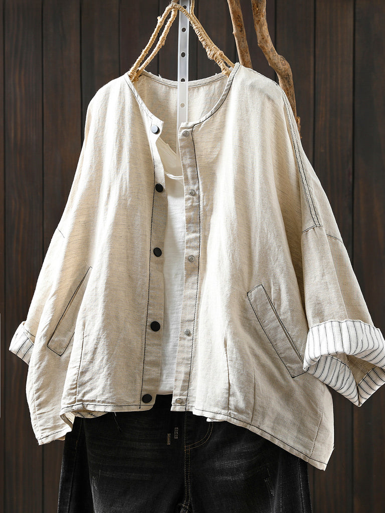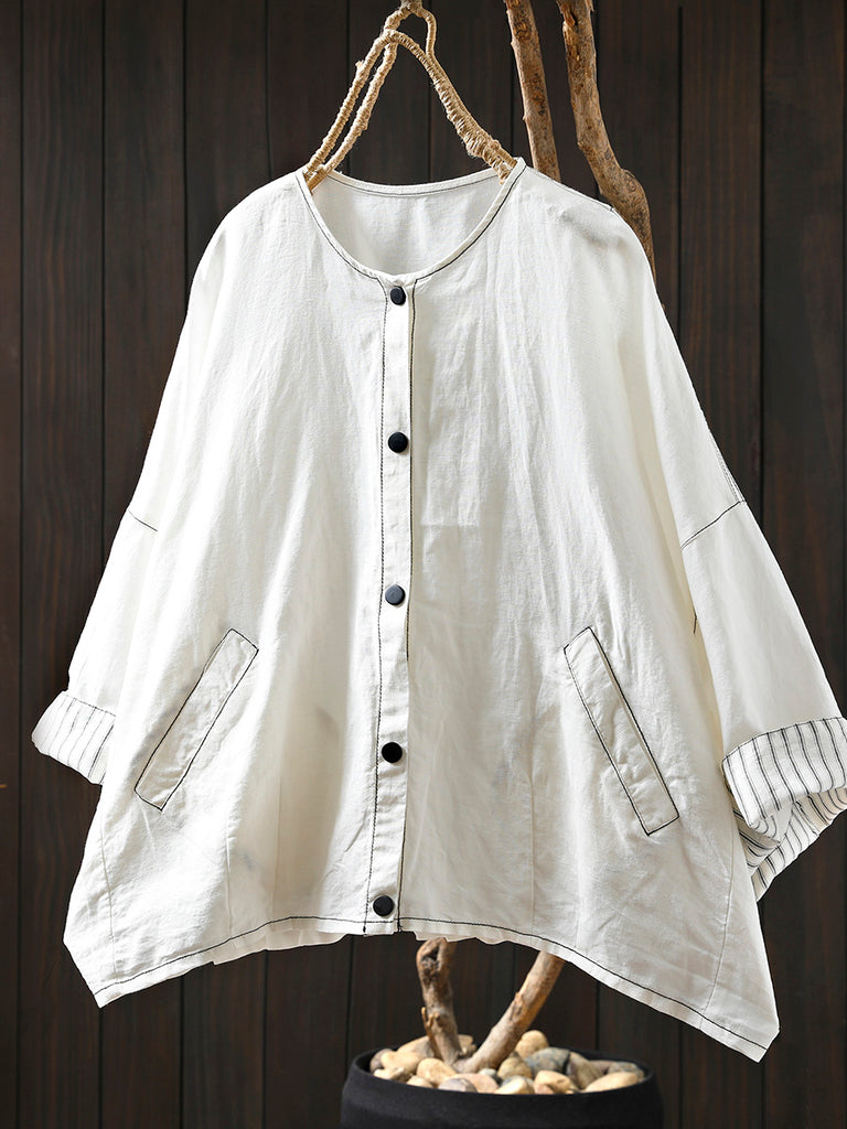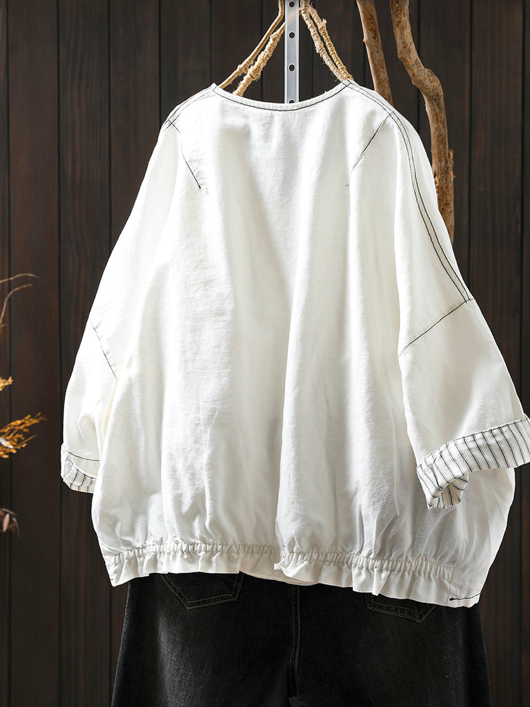 Chemise d'été en lin à rayures artistiques et col rond pour femme