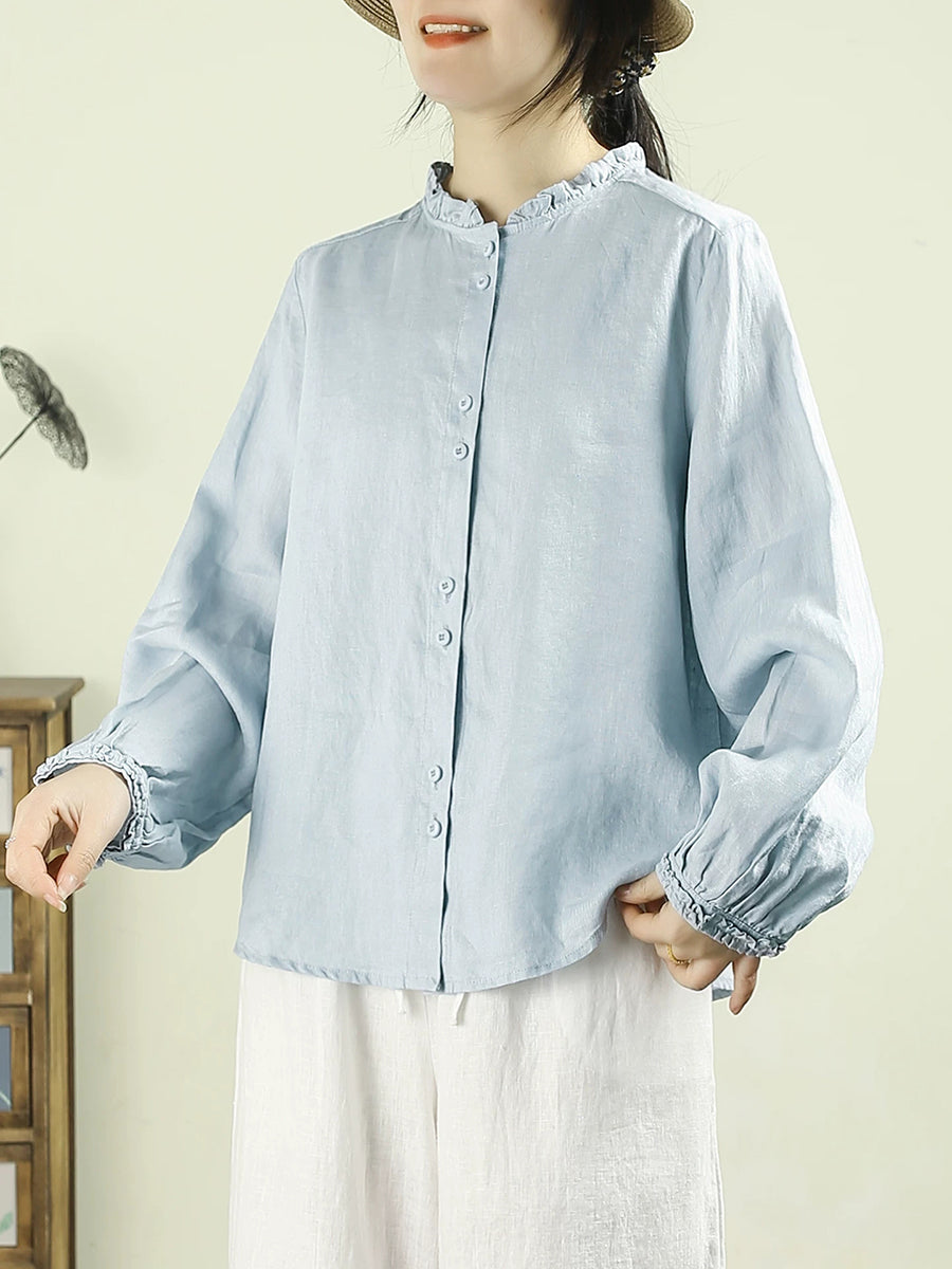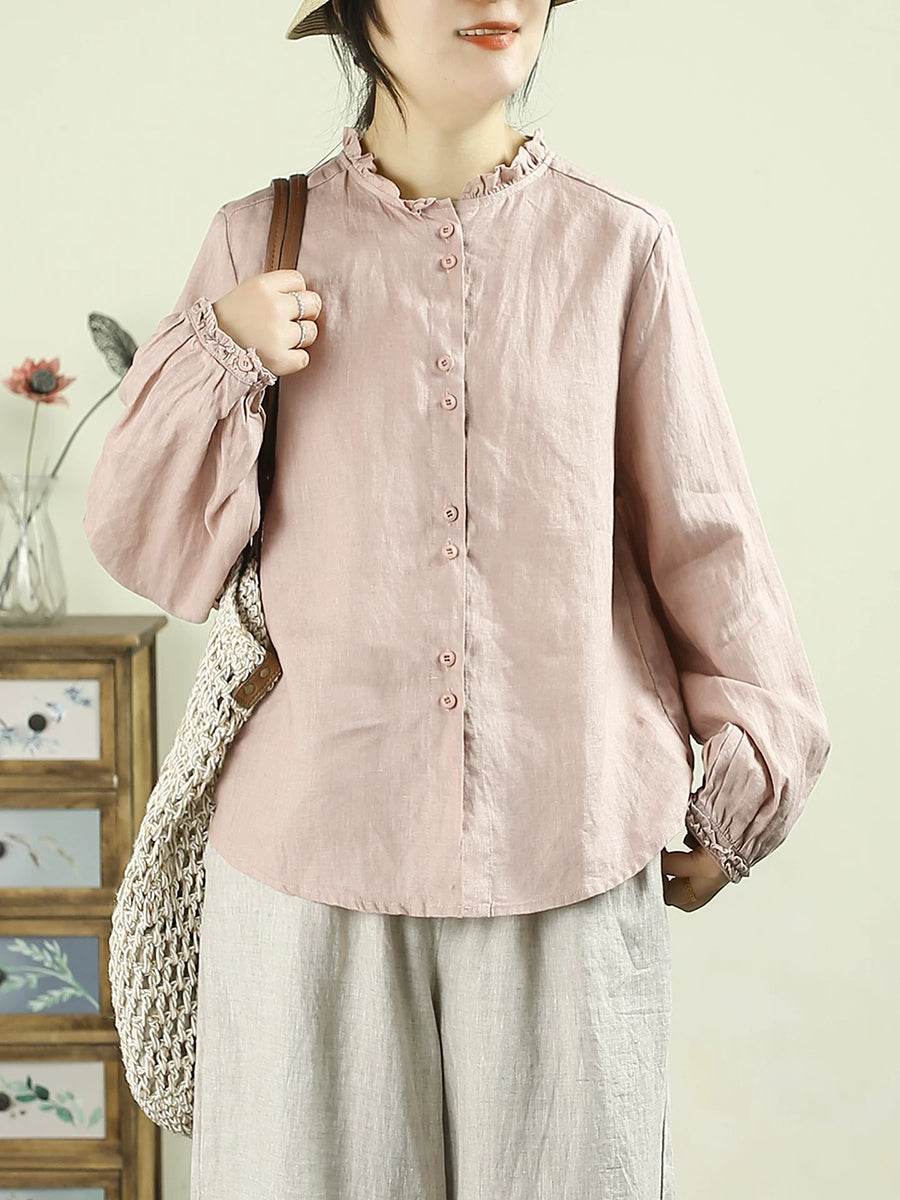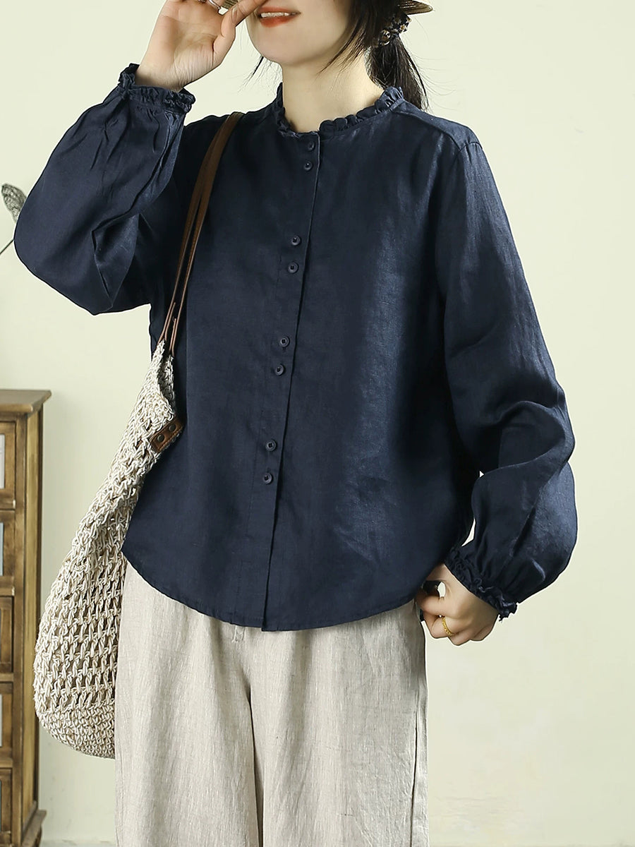 Chemise printanière artistique pour femme, col montant, couleur unie, 100 % lin