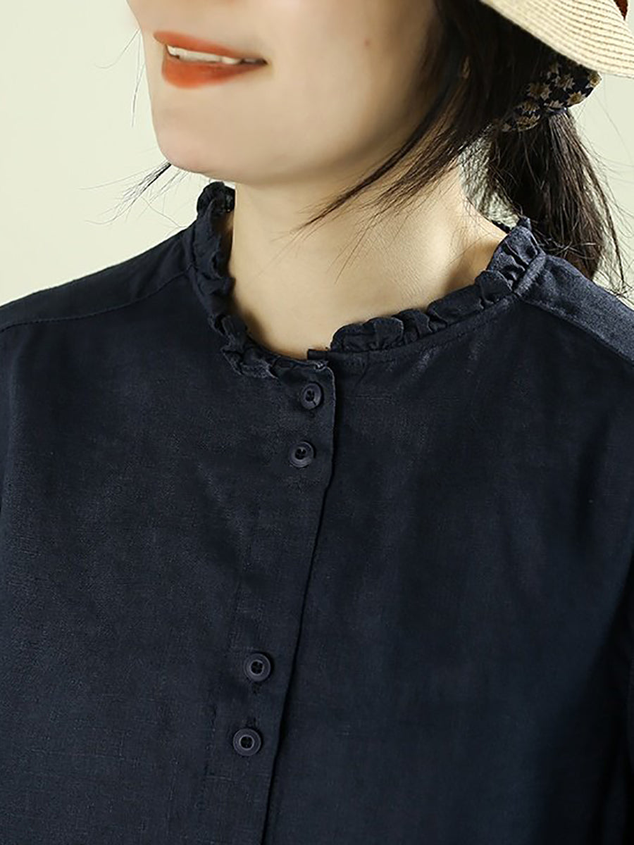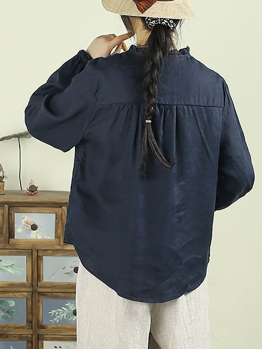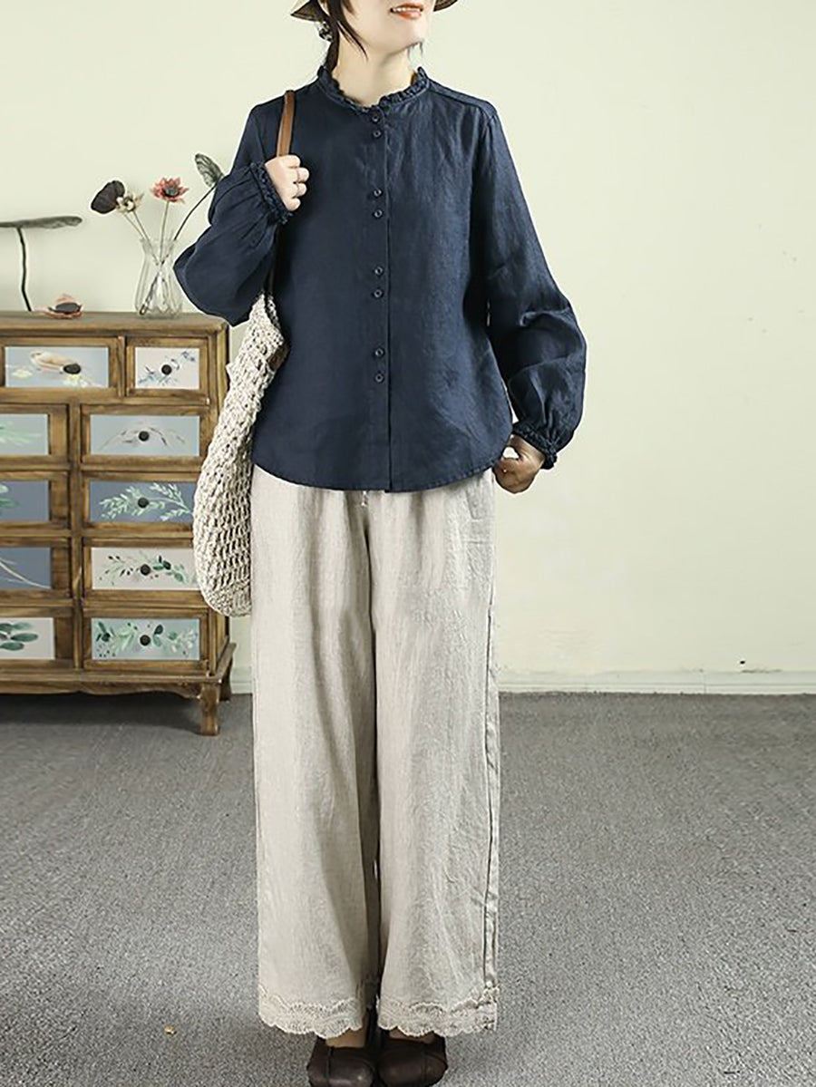 Chemise printanière artistique pour femme, col montant, couleur unie, 100 % lin