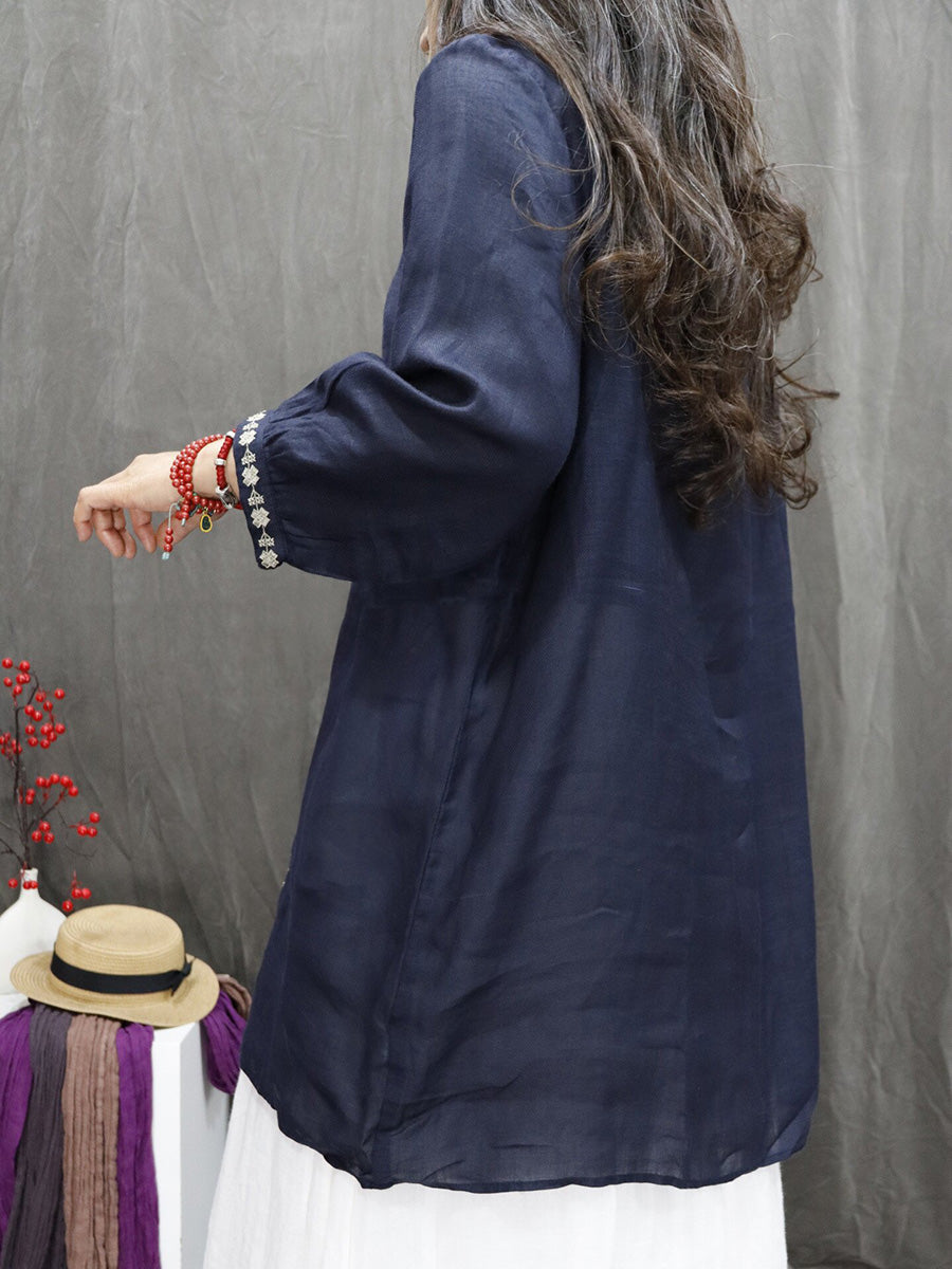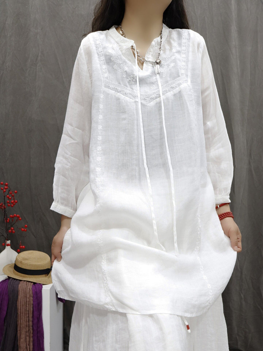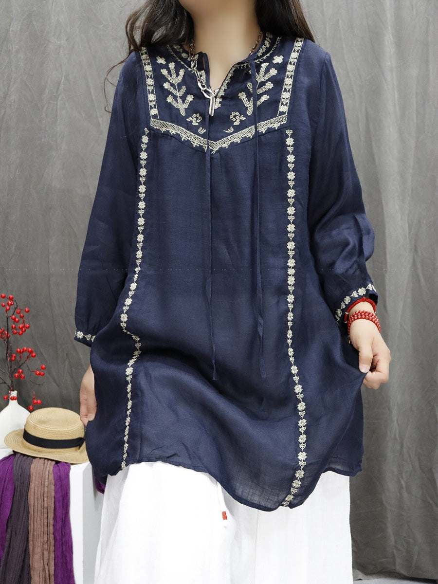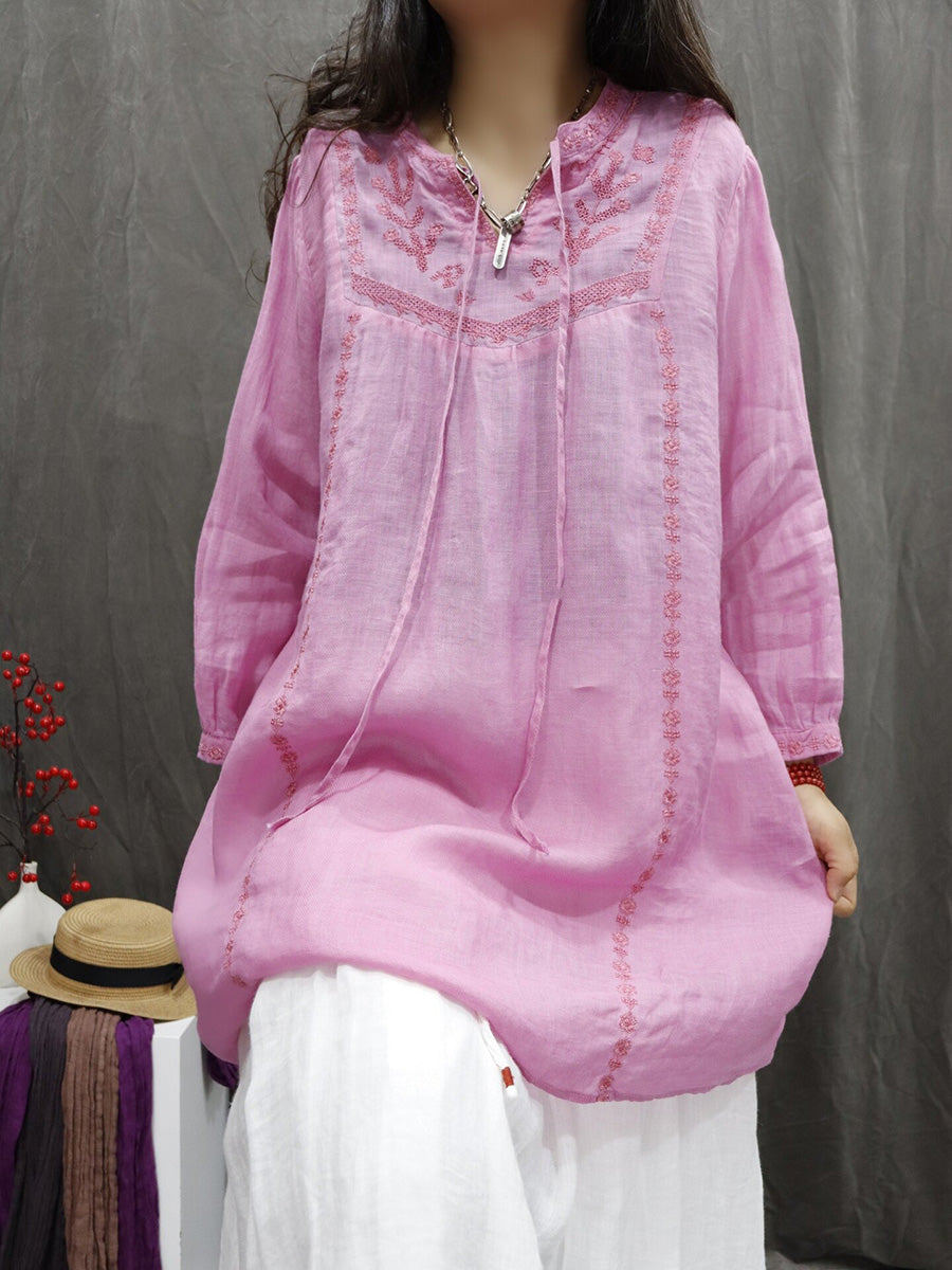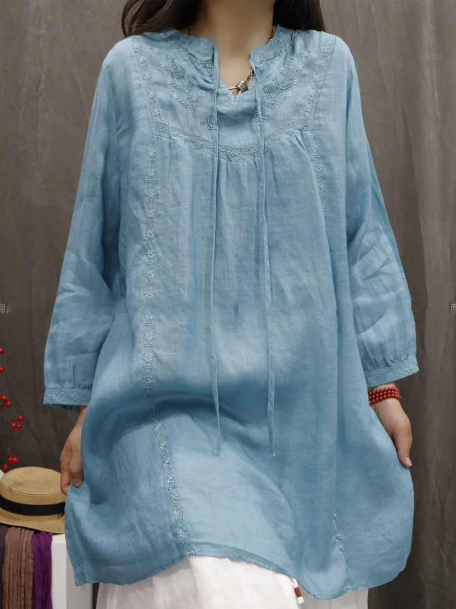 Chemisier à col en V 100 % ramie brodé artistique pour femme, idéal pour le printemps