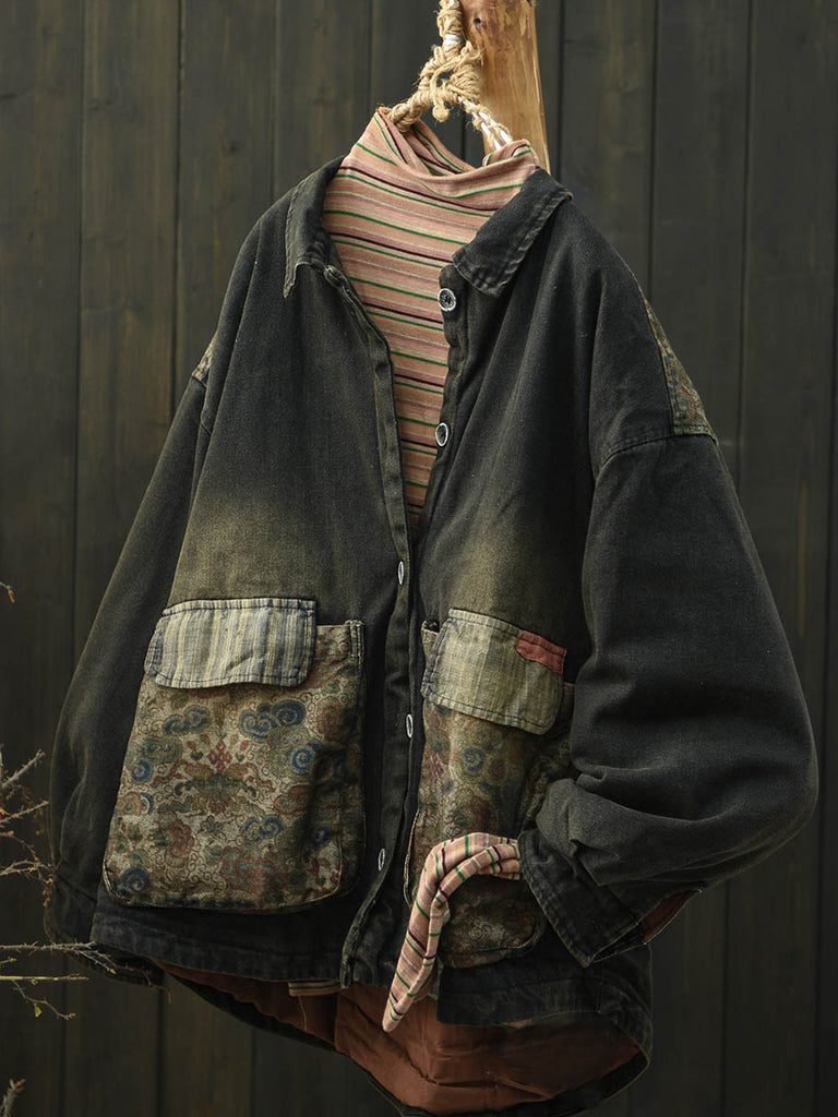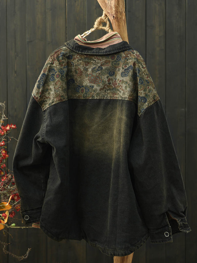 Manteau en coton à col rond et patchs floraux ethniques pour femmes