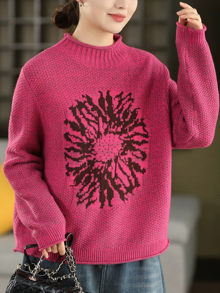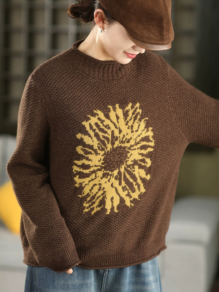 Women Autumn Artsy Floral Knitted O-Neck Sweater