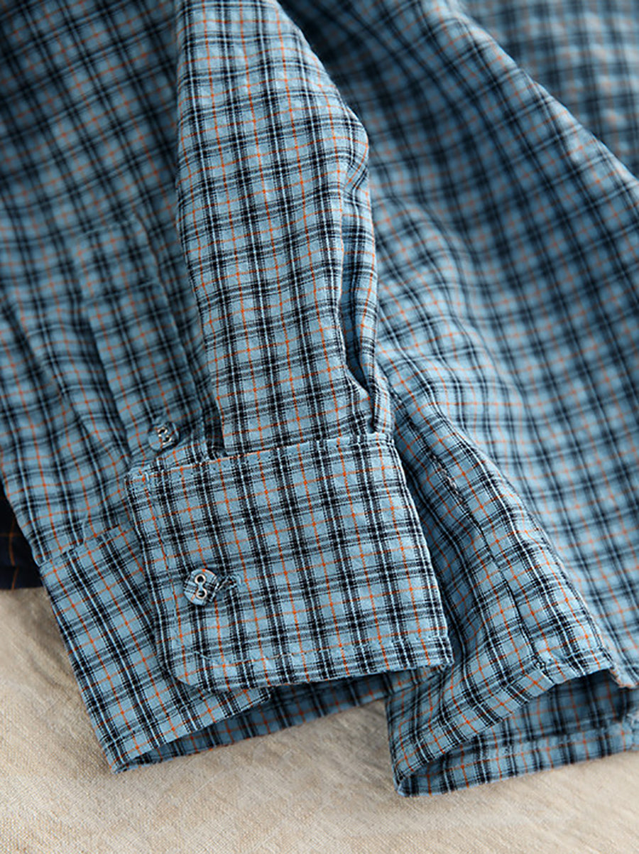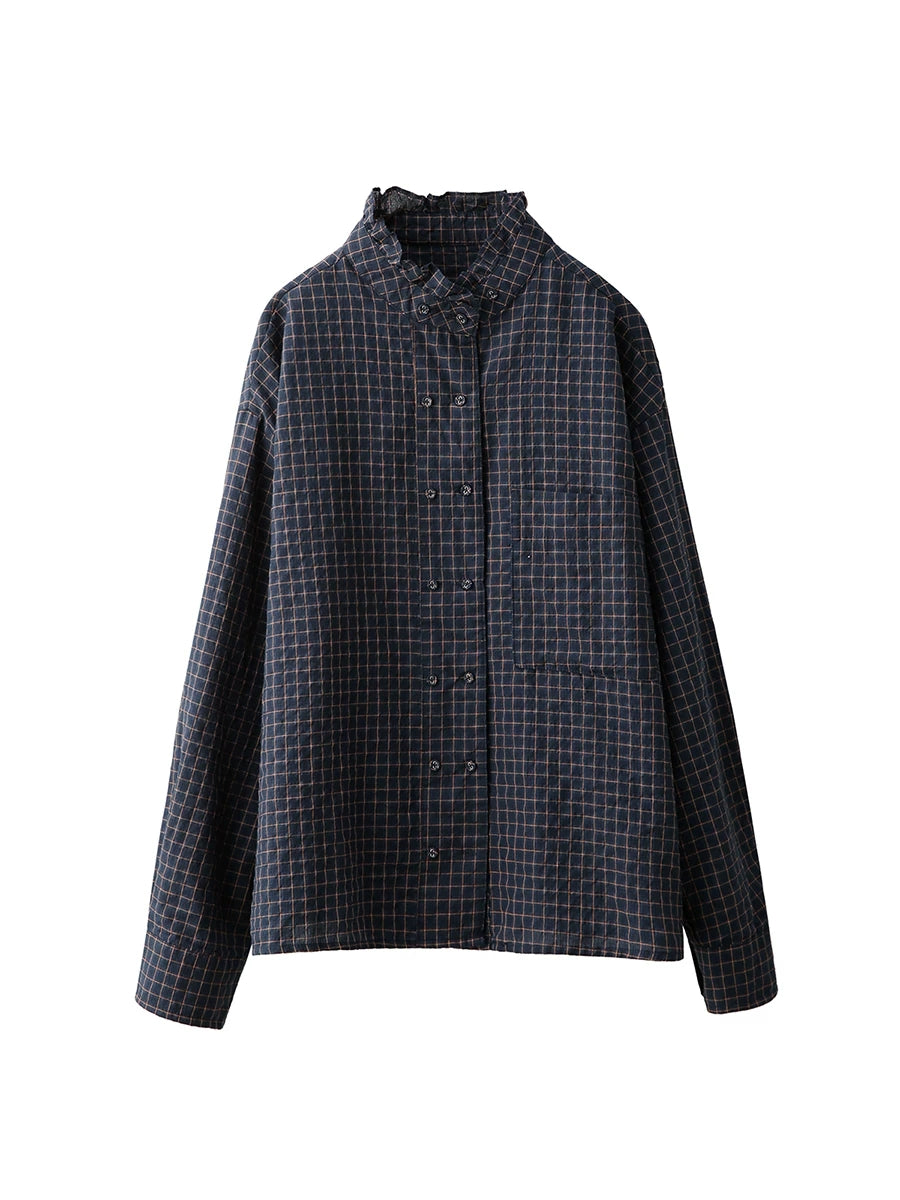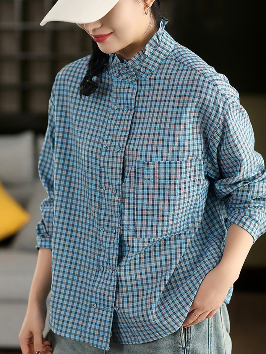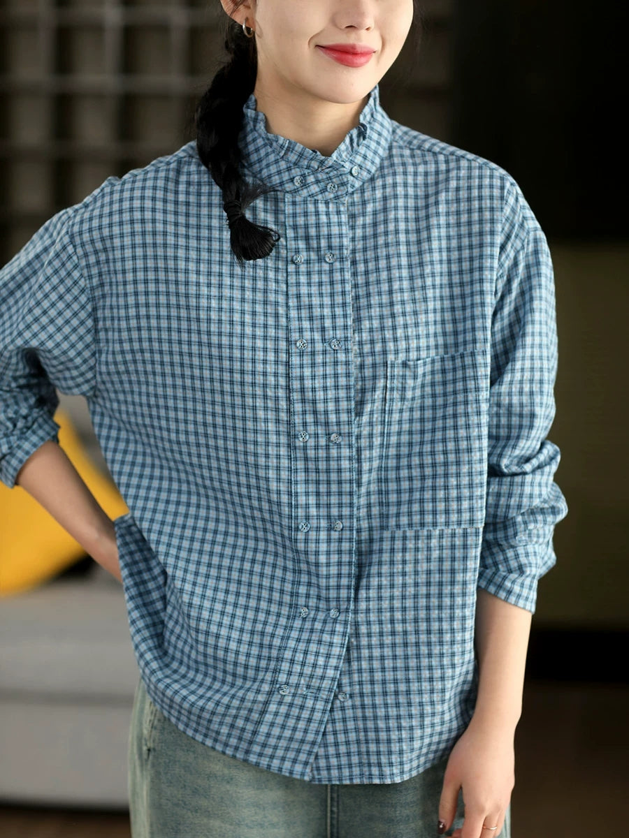 Chemise printanière pour femme en coton à col montant et motif treillis artistique