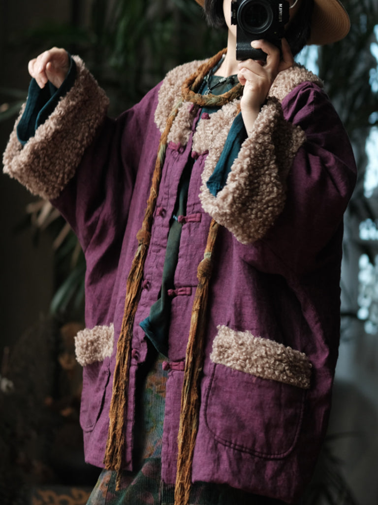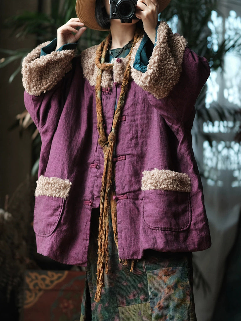 Women Vintage Winter Fleece Linen Stand Collar Coat