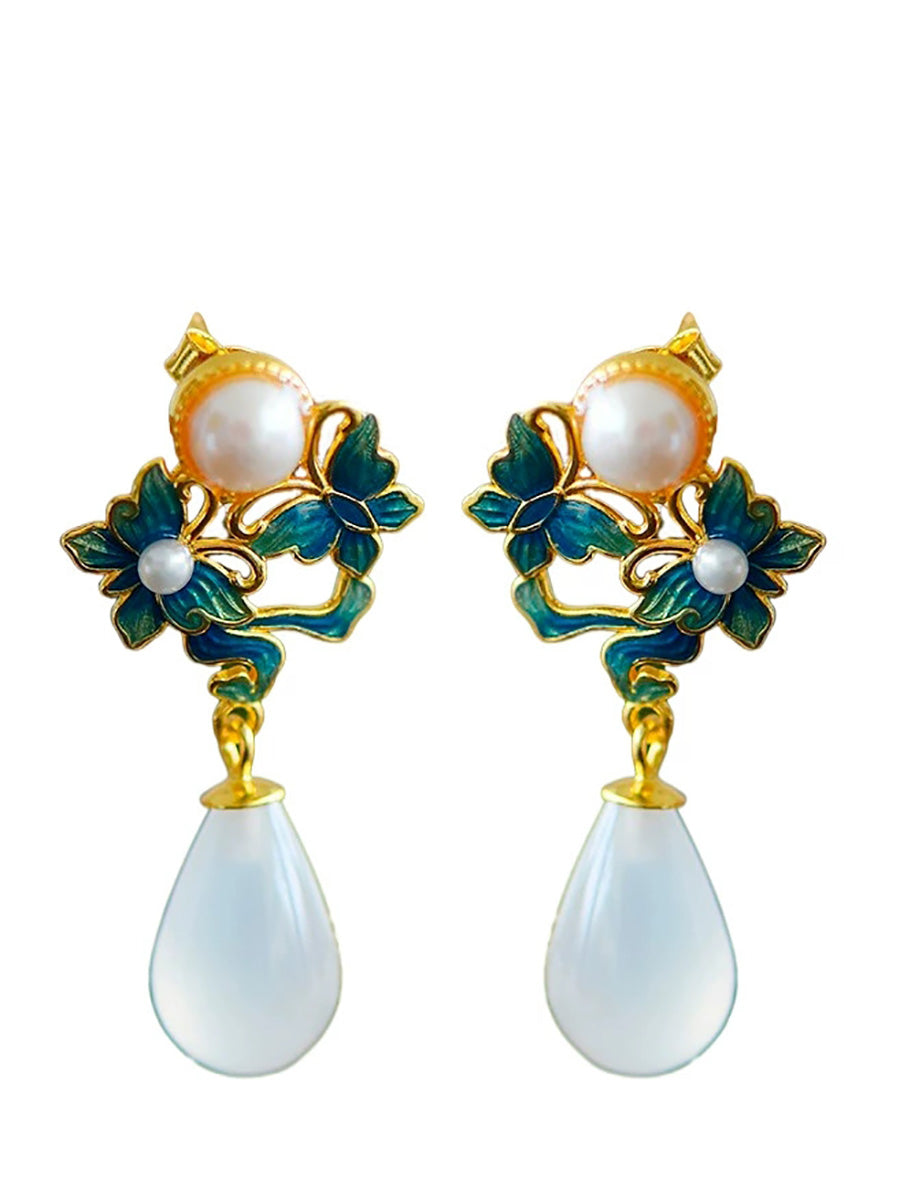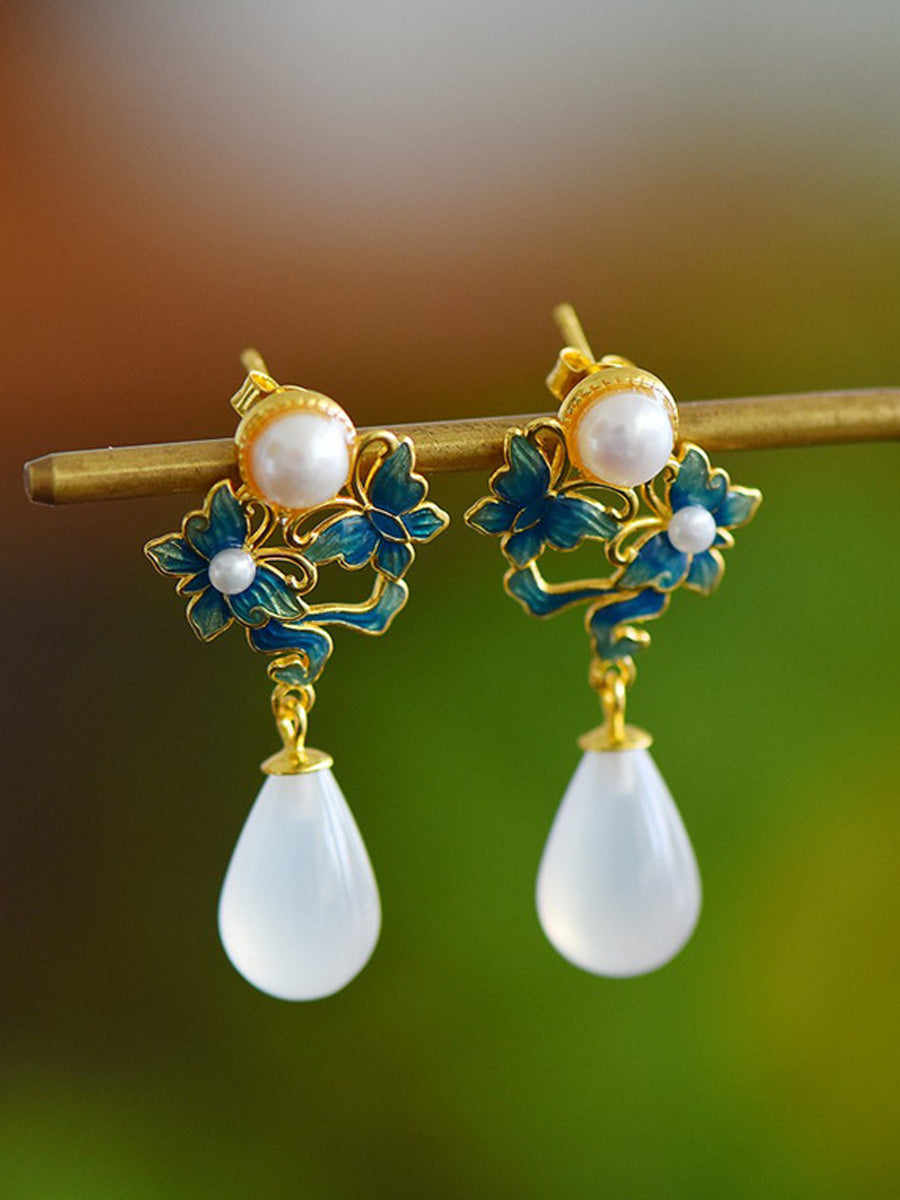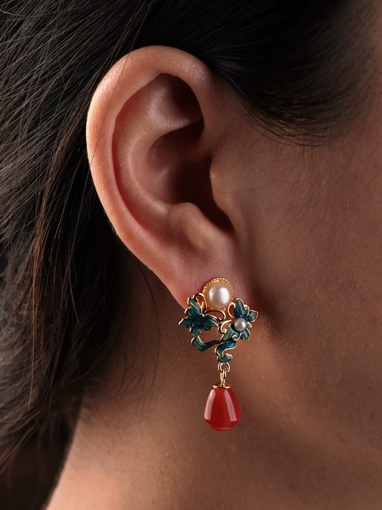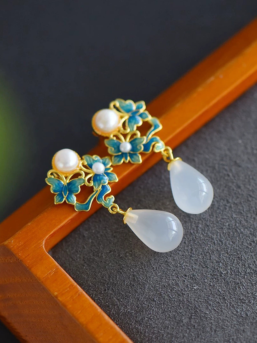 Women Ethnic Enamel Butterfly S925Silver Pearl Agate Earrings