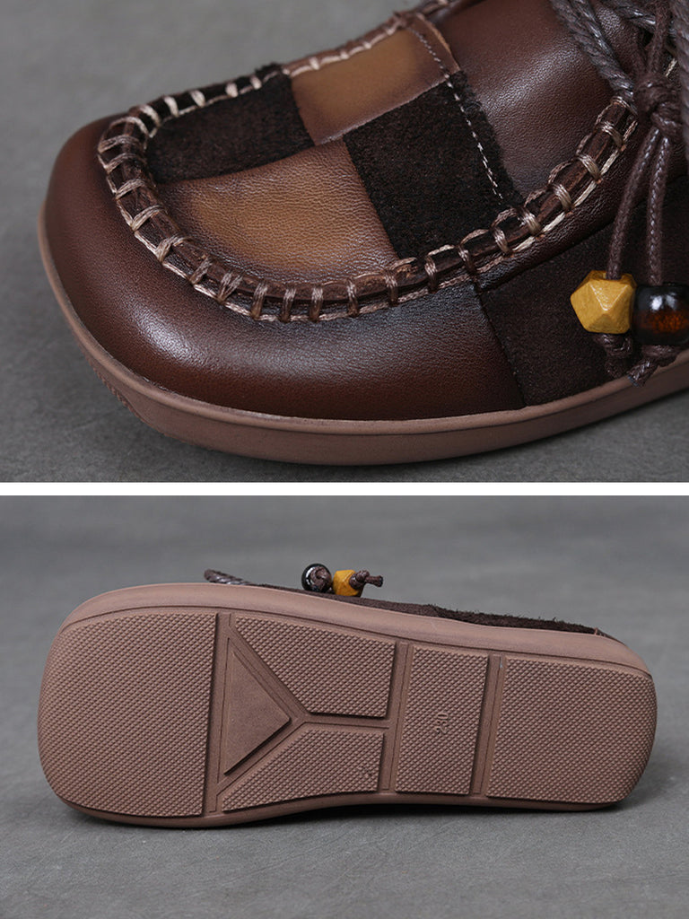 Women Retro Genuine Leather Plaid Spliced Flat Shoes