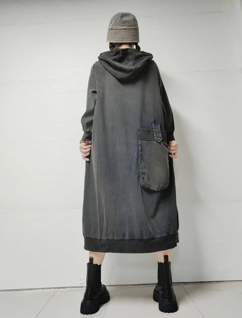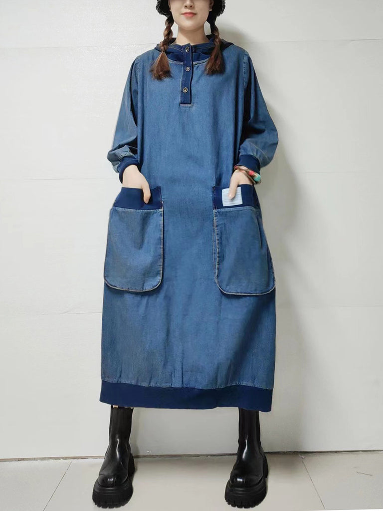 Women Autumn Retro Pure Color Denim Hooded Dress
