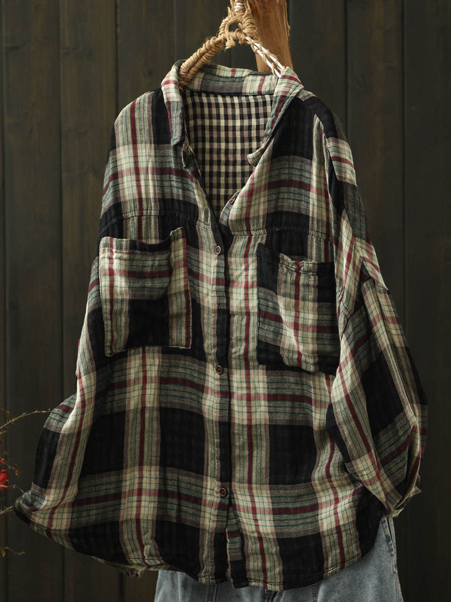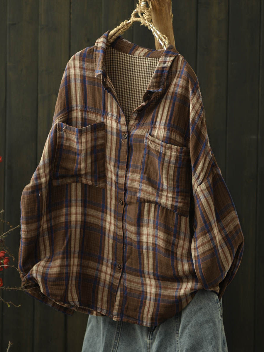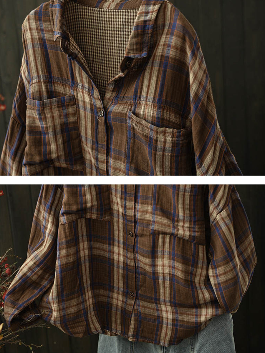Women Artsy Spring Plaid Cotton Turn-down Collar Shirt