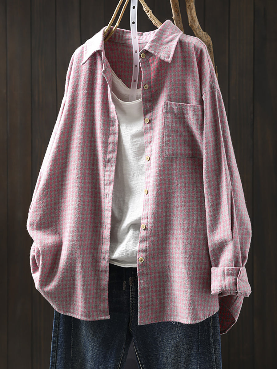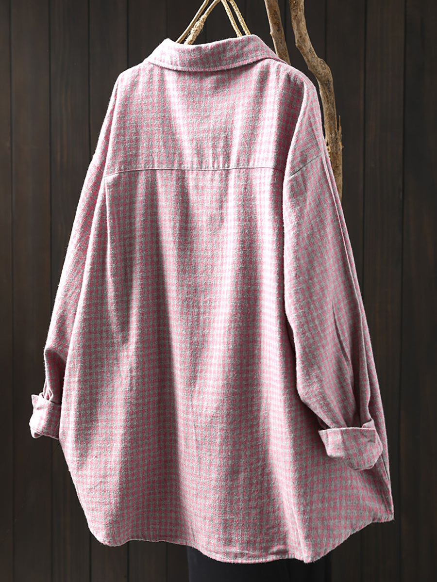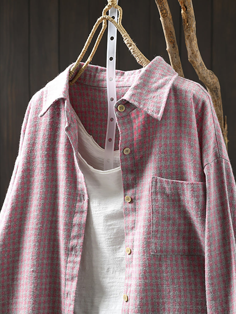 Women Autumn Plaid Turn-down Collar 100%Cotton Shirt