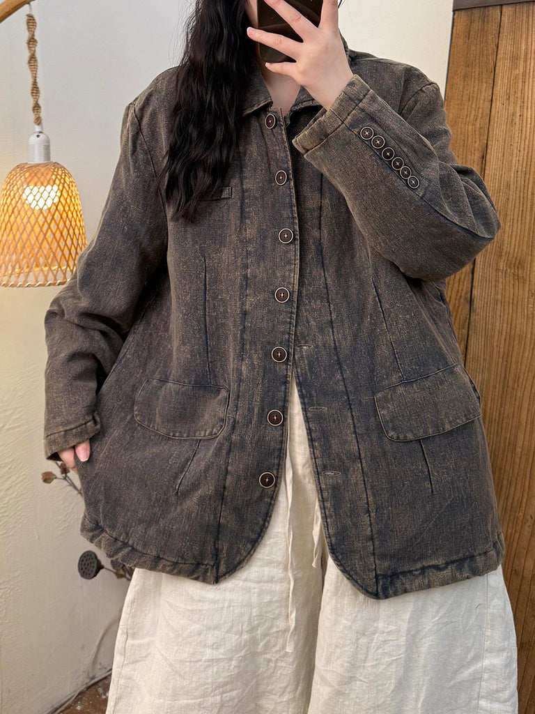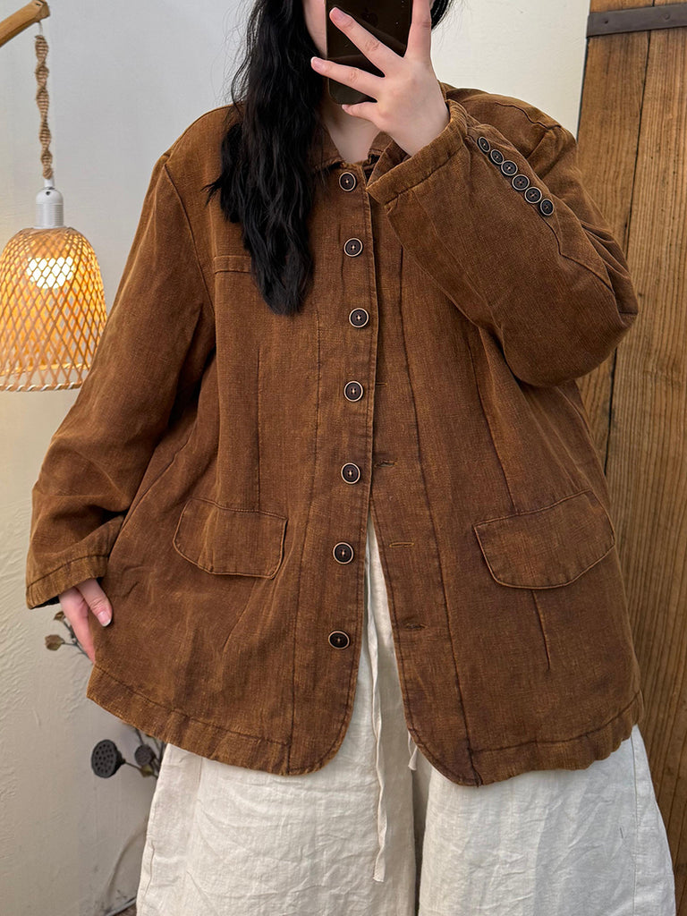 Women Vintage Winter 100%Linen Stand Collar Coat