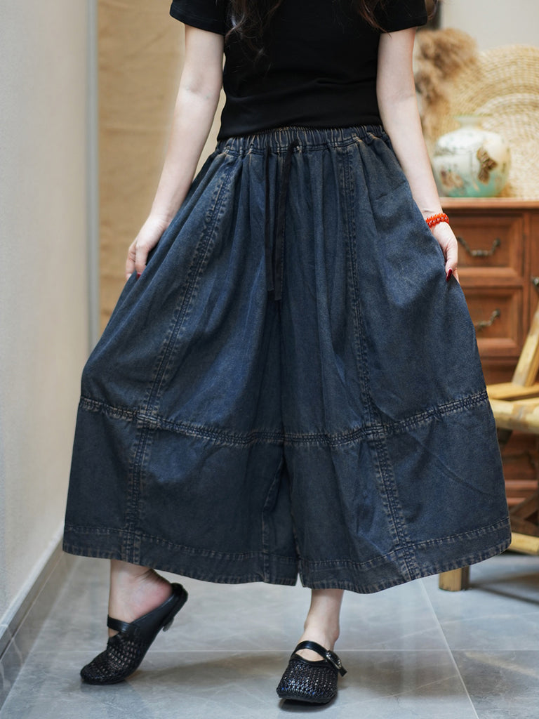 Women Casual Summer Pure Color Denim Wide-leg Pants