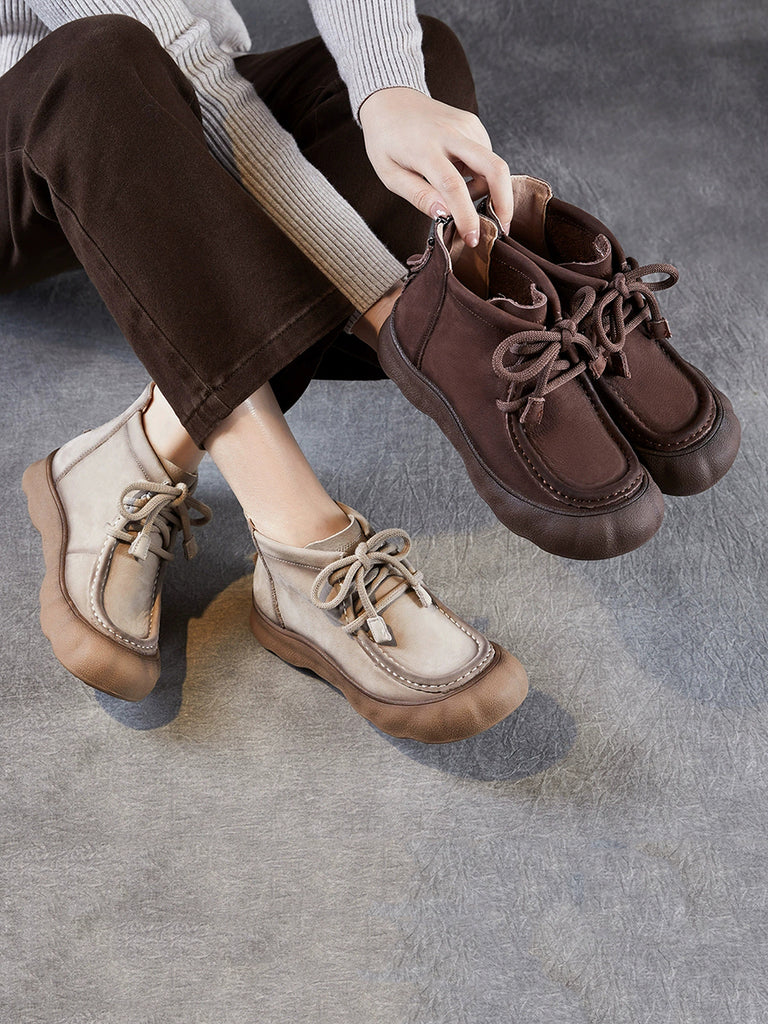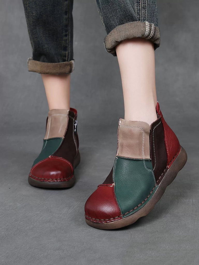 Women Winter Vintage Leather Colorblock Ankle Boots