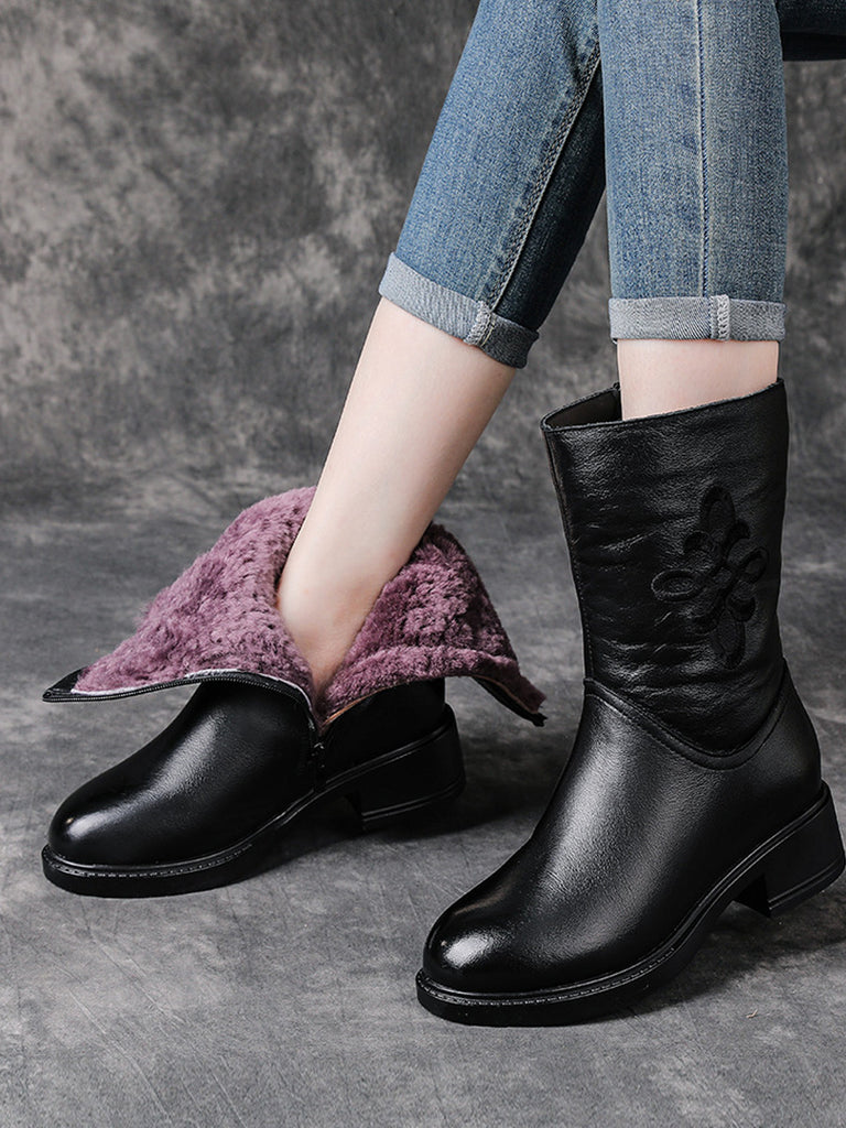 Women Winter Vintage Leather Flower Fleece-lined Boots