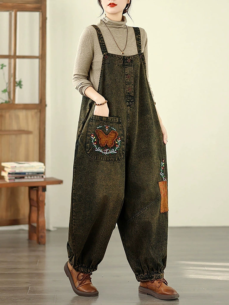 Women Spring Vintage Flower Embroidery Denim Jumpsuits