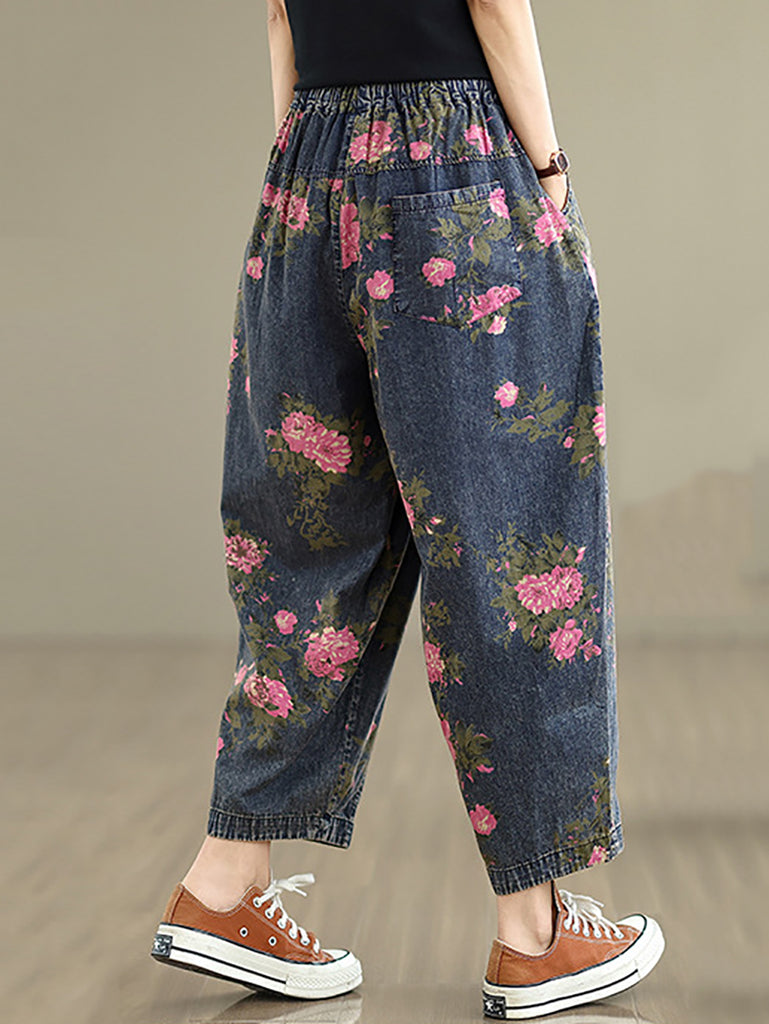 Women Casual Summer Flower Denim Harem Pants