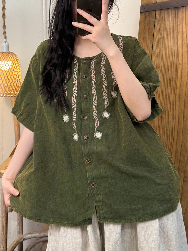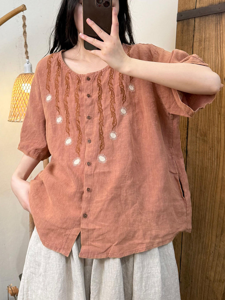 Women Artsy Autumn Embroidery 100%Cotton Shirt